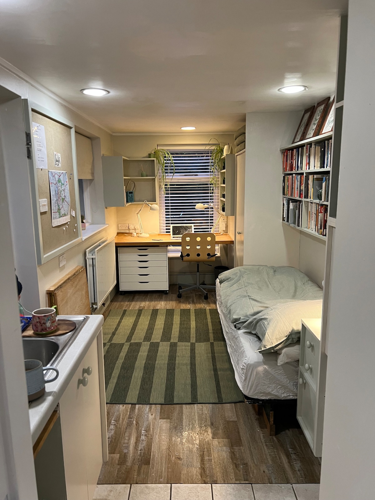 Kamar tidur belajar yang hangat, terang, dan lapang dengan pancuran dan toilet en suite serta area dapur kecilnya sendiri. Studio ini memiliki pintu masuk terpisah, parkir sepeda, dan pemandangan taman yang indah. Meja besar menjadi tempat tidur tanpa harus menyingkirkan pekerjaan Anda! Dapur memiliki satu kompor induksi, penggorengan udara, wastafel, dan kulkas. Studio dilengkapi peralatan lengkap termasuk semua seprai & handuk yang disediakan sehingga cocok untuk pengunjung luar negeri. Penggantian seprai dan handuk akan dilakukan setiap minggu dan sedikit bersih.