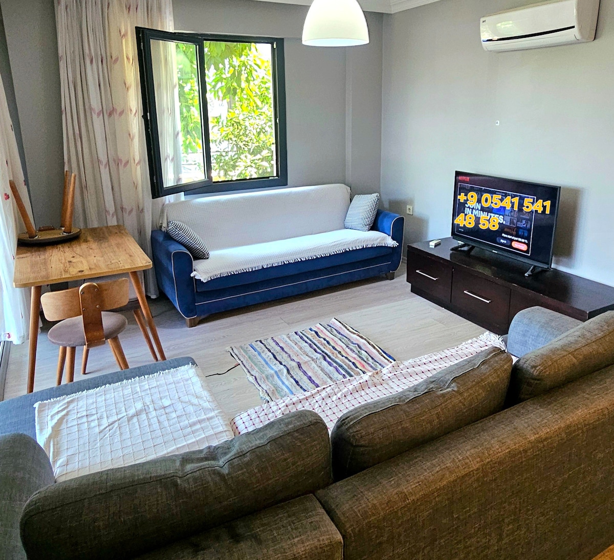 2 oda 1 salon zemin kat, Merkeze ve kordona arabayla 10 dakika mesefade, hızlı internet, sineklik, Ücretsiz üstü kapalı araç park yeri, Tüm odalarda klima vardır. Marketler yürüme mesafesindedir. Bahçe kullanımı sadece size aittir. Salon: 58 inç TV, 2 kişilik 1 adet koltuk, 1 adet tek kişilik koltuk, klima Mutfak: buzdolabı, çamaşır bulaşık makinesi, ocak, ankastre fırın, kahve makinesi, yemek takımı Teras: 6 kişilik oturma grubu Bahçe: 8 kişilik oturma takımı, barbekü, şemsiye