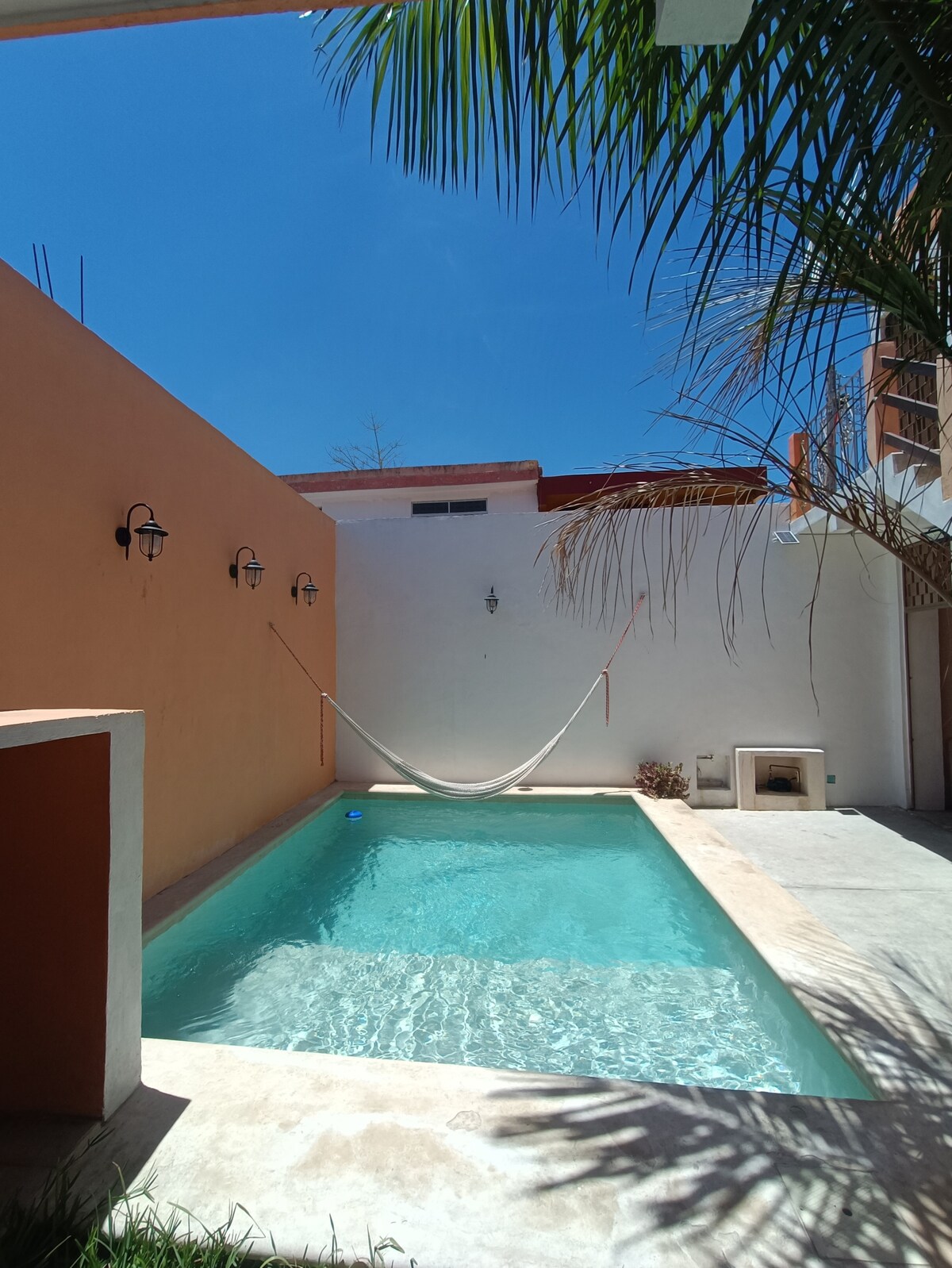 Es un alojamiento completo con alberca privada. Propiedad ubicada a unos pasos de la famosa calle 59, llena de cafés, restaurantes y bares. La decoración es colonial, la sala con sofá, tv de 50" con Netflix, Wi Fi, comedor para 6 personas, cocina con estufa de inducción magnética , refrigerador, horno de microhondas, 1 dormitorio con cama king size, TV de 32”, 1 aire acondicionado, ropero, baño con agua caliente y terraza con alberca. El Aire acondicionado solo hay en la habitación .