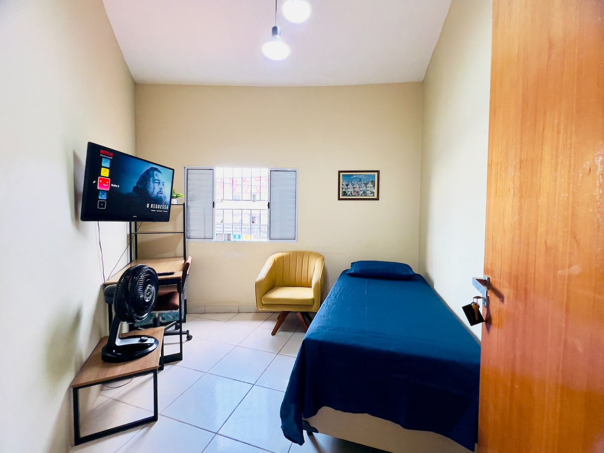 Tempat yang sangat sederhana dan tenang dengan kamar tidur, dapur dan kamar mandi untuk penggunaan eksklusif hingga 2 tamu yang disewakan bersama, dengan biaya tambahan kepada tamu kedua, untuk disepakati dengan tuan rumah. Pintu masuk independen. Lantai asrama yang baru ditukar dengan lantai dingin. Suasana keluarga di mana pendidikan, perilaku yang baik, tanggung jawab diterima. Terima kasih untuk tidak merokok di dalam. Tidak direkomendasikan untuk anak - anak. Ada parkir gerbang elektronik dengan biaya tambahan. R$ 13,00 per hari.