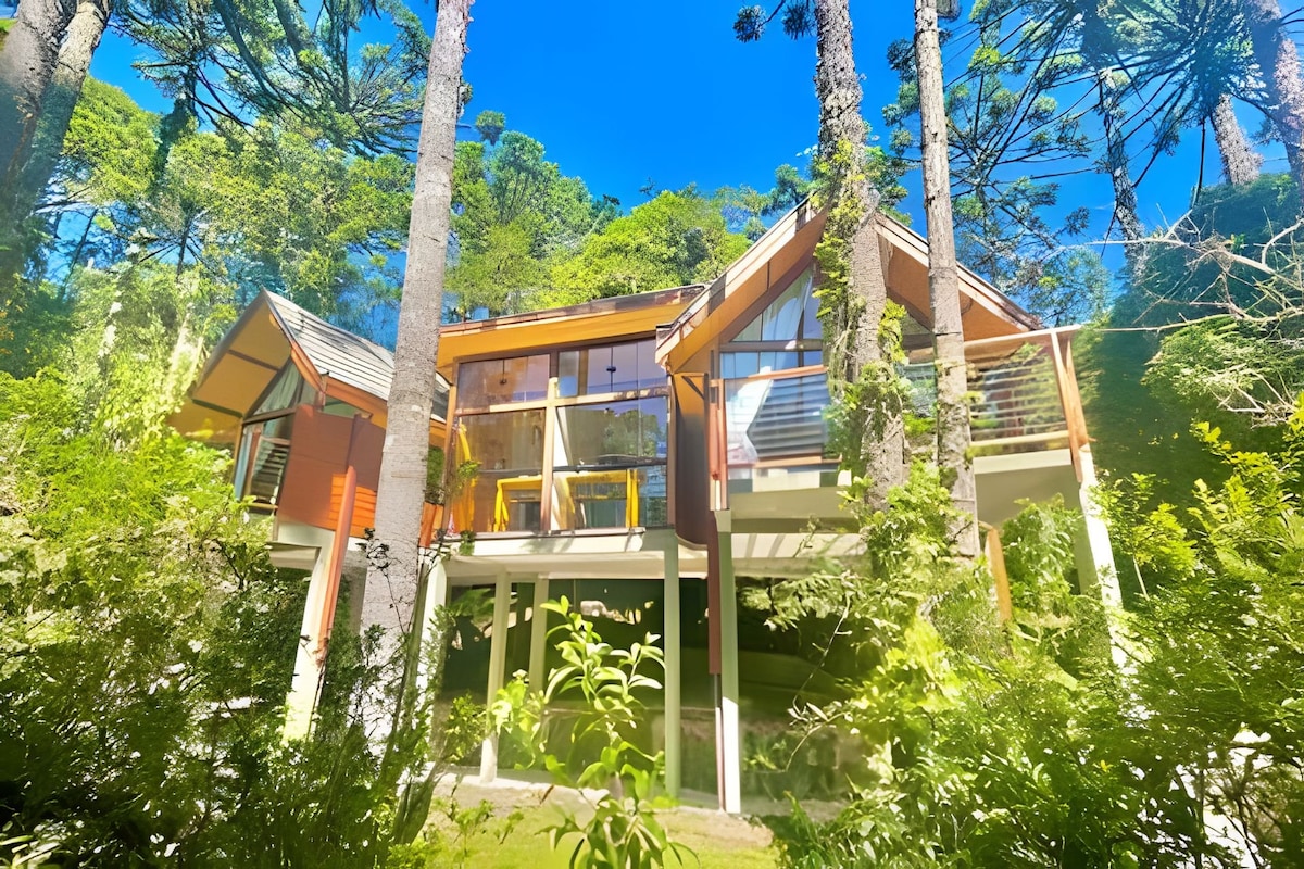 Uma cabana de madeira no alto de uma montanha com vistas exuberantes e toda a infra estrutura de uma casa completa. Região tranquila, a 7km do agito do Capivari. Você vai viver toda a tranquilidade das montanhas, nāo estando isolado. Internet fibra ótica, mercadinhos e restaurantes estão a sua disposição, fora um ofurô com vista pro vale e um fogo de chão para aquecer as noites geladas de Campos do Jordão . Venha viver as montanhas com a gente!