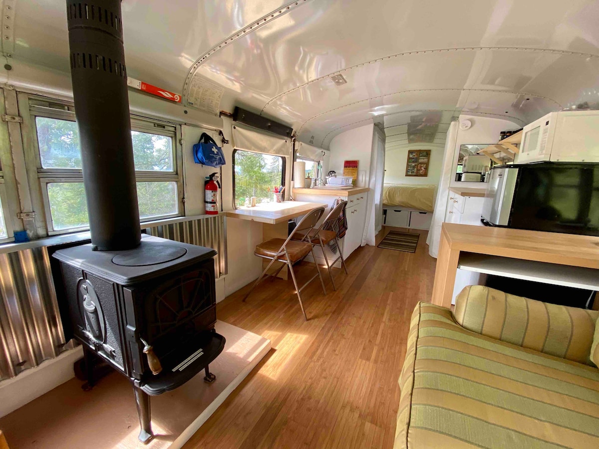Converted Bus in Nature with Woodstove