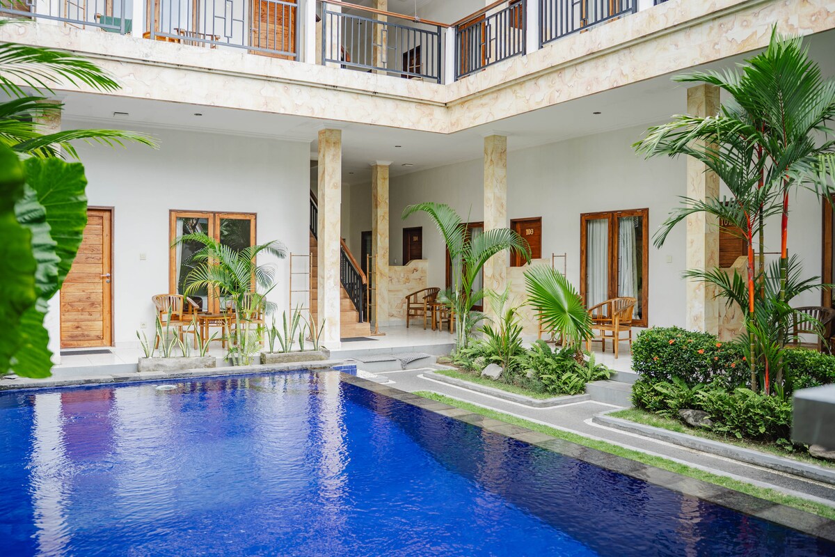 Comfortable rooms with peaceful ambiance that allows you to make the most out of each stay. The guest house has an outdoor swimming pool with sharing kitchen, parking area and wifi high speed internet connection throughout the guest house. Located about 5 minutes from the beach (Berawa, Batu Bolong, Echo) and just 5 minutes from Seminyak. Close to famous Finn Beach Club, Atlas Beach Club, and many other signature venues. Stay with us for an authentic experience.