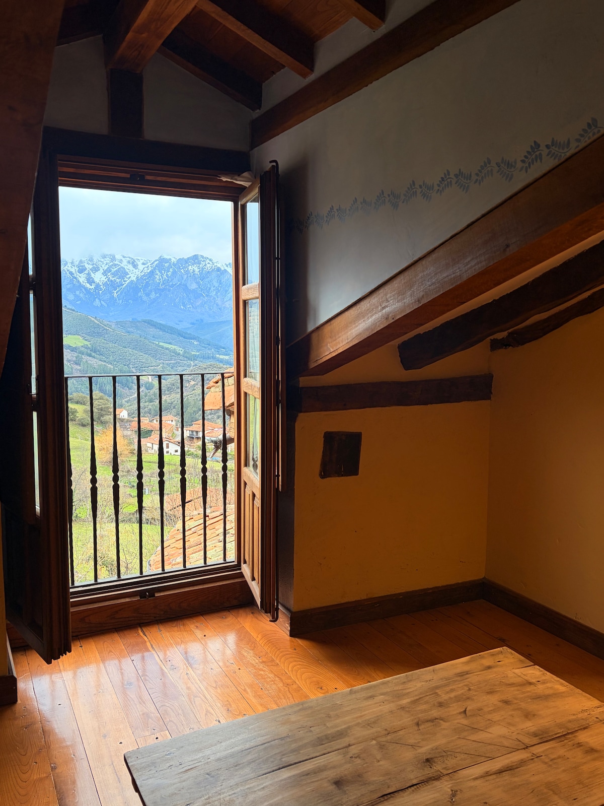 Kamar 4 berada di lantai pertama, tetapi kami memiliki forklift untuk naik dan turun tas kami. Dengan orientasi barat daya, kamar yang nyaman ini memungkinkan Anda menikmati matahari terbenam yang indah. Dari jendelanya Anda bisa melihat desa Liérganes dan lembah indah yang mengelilinginya.