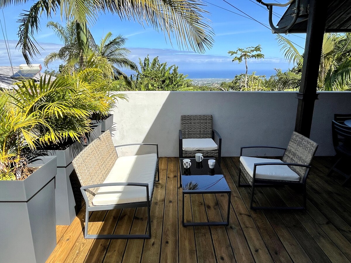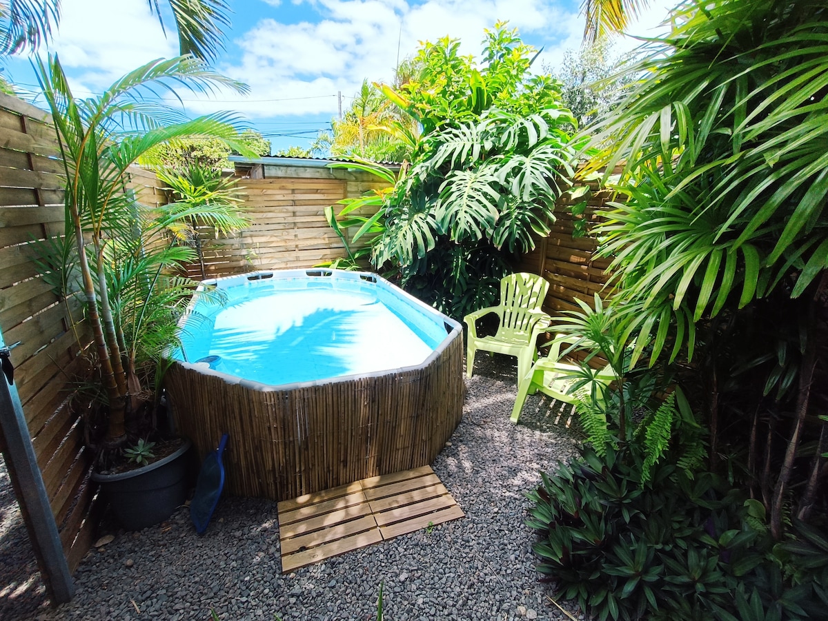 Dans un joli jardin créole clos de 1000m2 ( litchis, longanis, avocats, vanille, mangues, Pitaya, coco...) venez vous réveiller avec une magnifique vue sur les montagnes dans un bungalow récent conçu en bois local, avec son entrée indépendante et aménagée avec charme. Vous pourrez aussi vous détendre et vous relaxer toute l'année dans une piscine partagée en pierre naturelle entre 28 et 30°C. À partir de 7 nuits et au delà, une remise est consentie. Alors n’hésitez plus ! ☺️