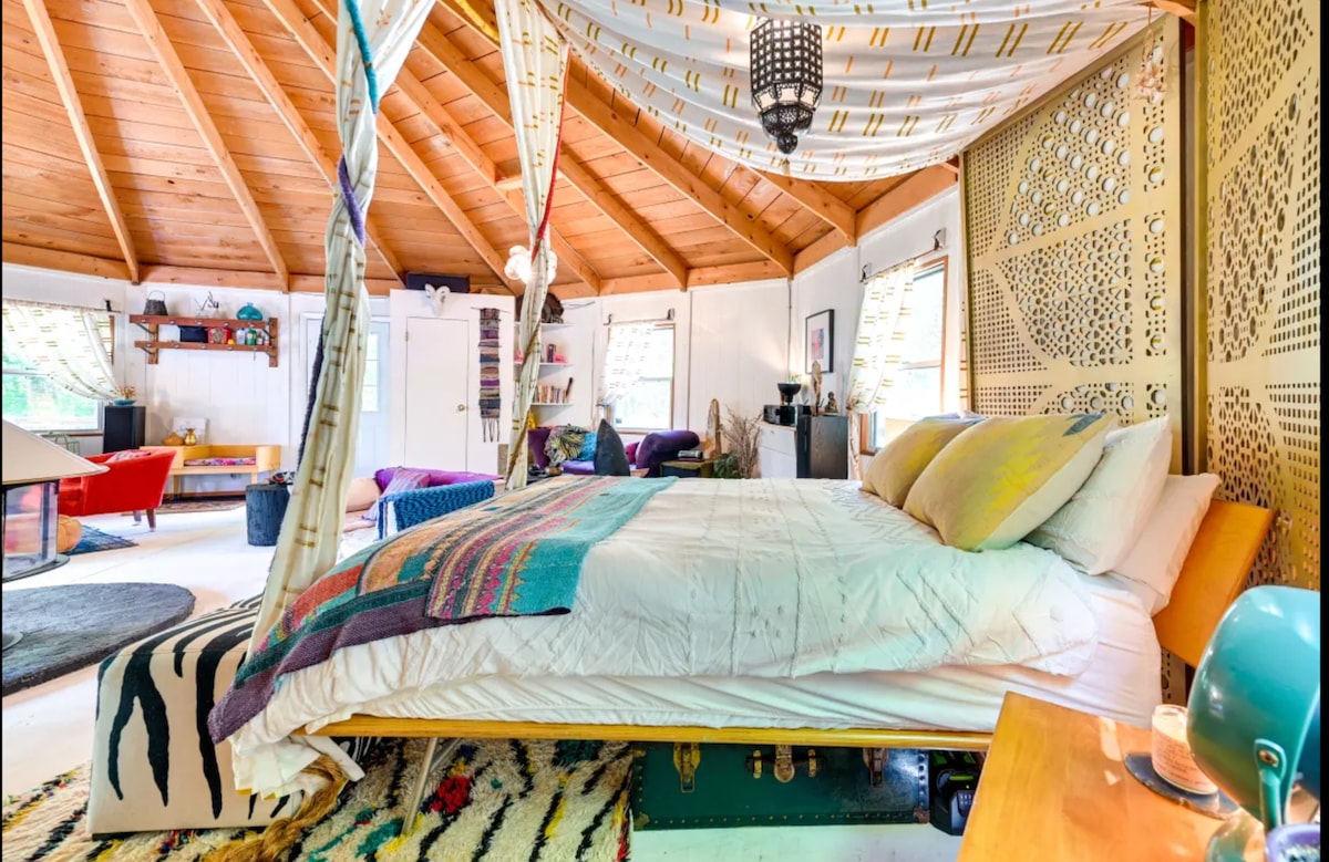 5 menit dari Phoenicia. Yurt yang nyaman untuk 2 orang di tengah pohon elderberry, persik, pir, dan apel liar, kolam ikan mas, taman sayuran, dan perbukitan berhutan. Padang rumput tersembunyi untuk meditasi dan penyembah matahari. Skulptur baja besar. WiFi cepat. Pancuran luar ruangan dengan dinding kaca menjadi hangat di pagi hari yang cerah bahkan di musim dingin. Toilet kompos tanpa pembilasan dari kayu cedar bebas bau. Dapur mini, api unggun, dan pemanggang gas. Semua orang dari setiap ras, agama, jenis kelamin, dan kebangsaan diterima di sini! Bahkan makhluk luar angkasa.