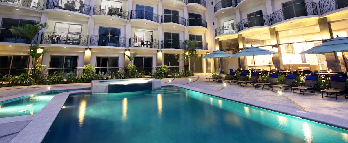 BAR bio, GYM, Check - in 24 jam, kebersihan harian, SUITE MEWAH 1KT dengan tempat tidur queen di ruang utama & sofa - bed di ruang tamu, dapur lengkap, peralatan mewah, finishing mewah, dua balkon, ideal untuk pasangan & keluarga kecil. AC, pengering rambut, kipas angin langit - langit, TV kabel digital, LED. Terletak di proyek luxurius Oceano di Jaco. Kami Ramah Anjing! (Biaya tambahan) Termasuk sarapan *
