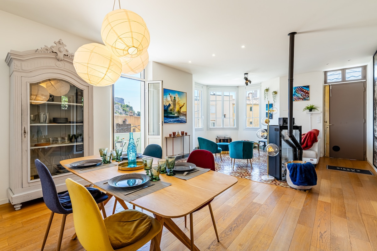 Tres bel appartement de 42 m2 avec terrasse sur le port de Cassis , la sardinette dispose d'une vue exceptionnelle sur la mer et le cap Canaille.Entierement rénové par une architecte d’intérieur Prestations haut de gamme et tout le confort souhaité (climatisation, lave vaisselle, lave linge séchant, four micro-ondes , machine nespresso). Ce petit écrin se situe à 5 mns à pied des plages et à proximité des célèbres calanques de Cassis.
