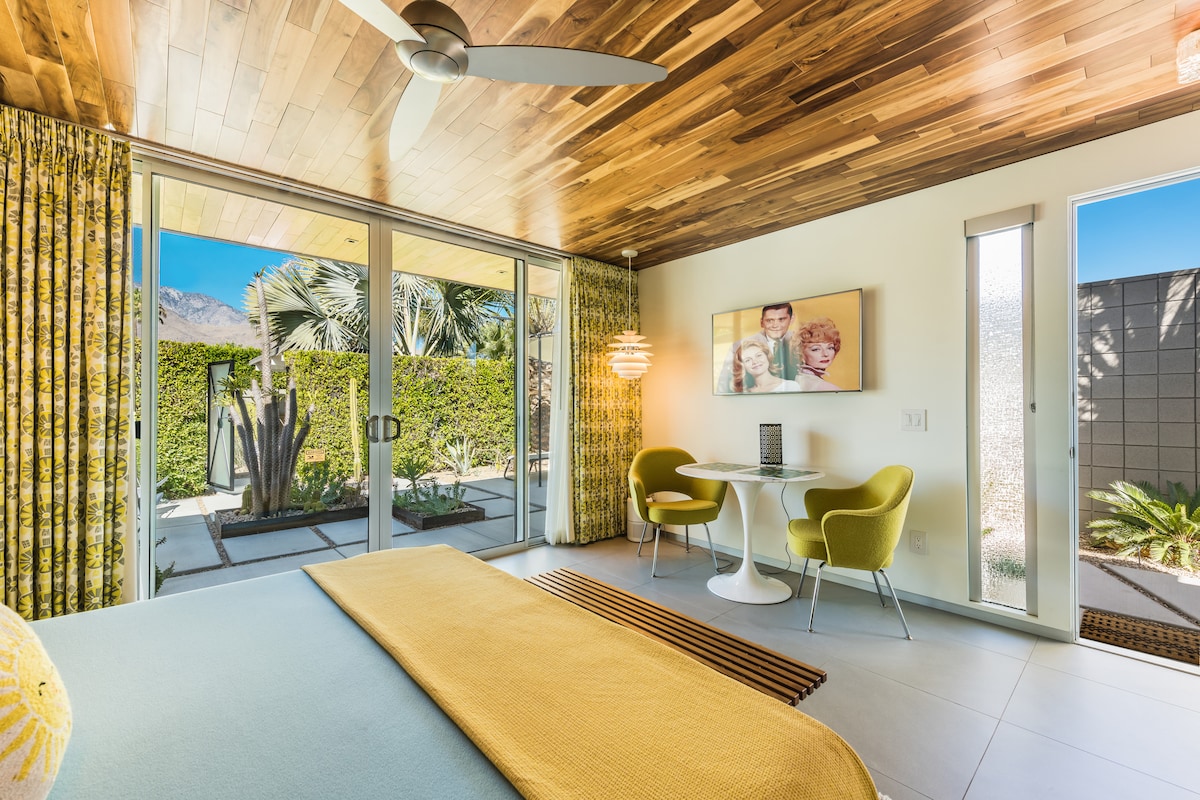 Terletak di pusat Palm Springs, rumah tamu pribadi Modern Abad Pertengahan yang menggemaskan ini dibangun pada tahun '71 dan disegarkan agar sesuai dengan rumah'60 kami. Persiapkan seperti kamar hotel (270 kaki persegi) dengan pintu masuk pribadi, teras, perapian kecil, area bersantai, dan pancuran luar ruangan pribadi. Ada dapur kecil (tidak ada memasak). Cocok untuk lajang & pasangan. Khusus dewasa. Termasuk akses ke halaman utama, kolam renang bersama & spa baru! Dimiliki/dioperasikan oleh LGBTQ. Lingkungan tinggal memiliki koleksi rumah abad pertengahan yang luar biasa!