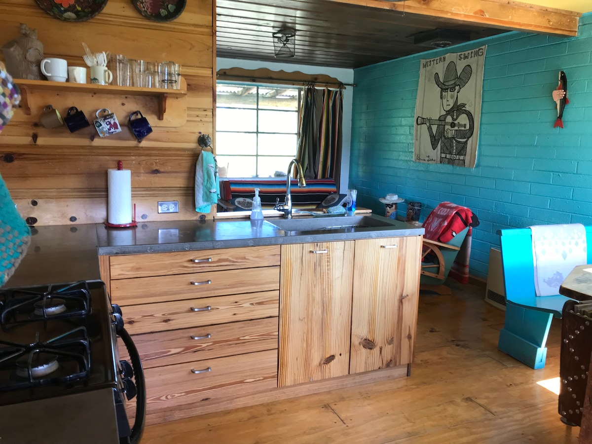 Tempat yang sempurna untuk bersantai, memulihkan energi, dan berkumpul kembali. Kabin ini terselip di suaka penyelamatan hewan. Ada kolam, pepohonan naungan, kebun dan tanaman berbunga. Langit malam sangat gelap, airnya manis, WiFi cepat, menara Verizon dekat, Cosmic Campground sedikit di atas jalan & Catwalk Recreational Trail berjarak 4,5 mil dari sini. Manjakan diri di tempat yang tenang, berjalan - jalan di Labirin, bersantai di tempat tidur gantung, mengunjungi hewan. Galeri, Seni, Keajaiban, Kuil & Patung berlimpah