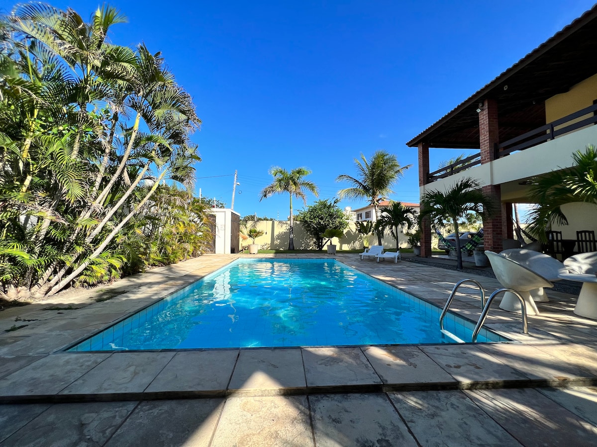 Rumah kami cukup besar, hanya 2 blok dari pantai, 3 menit berkendara ke Desa Cumbuco. Ideal untuk selancar layang, dengan taman yang luas dan halaman rumput dan pohon buah - buahan yang indah. Tempat parkir tersedia untuk lebih dari 8 kendaraan. Selain rumah besar, terdapat kamar tambahan dengan kulkas dan 2 tempat tidur di samping kolam renang. Kami memiliki pembantu rumah tangga yang bisa membantu membersihkan rumah dengan sedikit biaya tambahan.