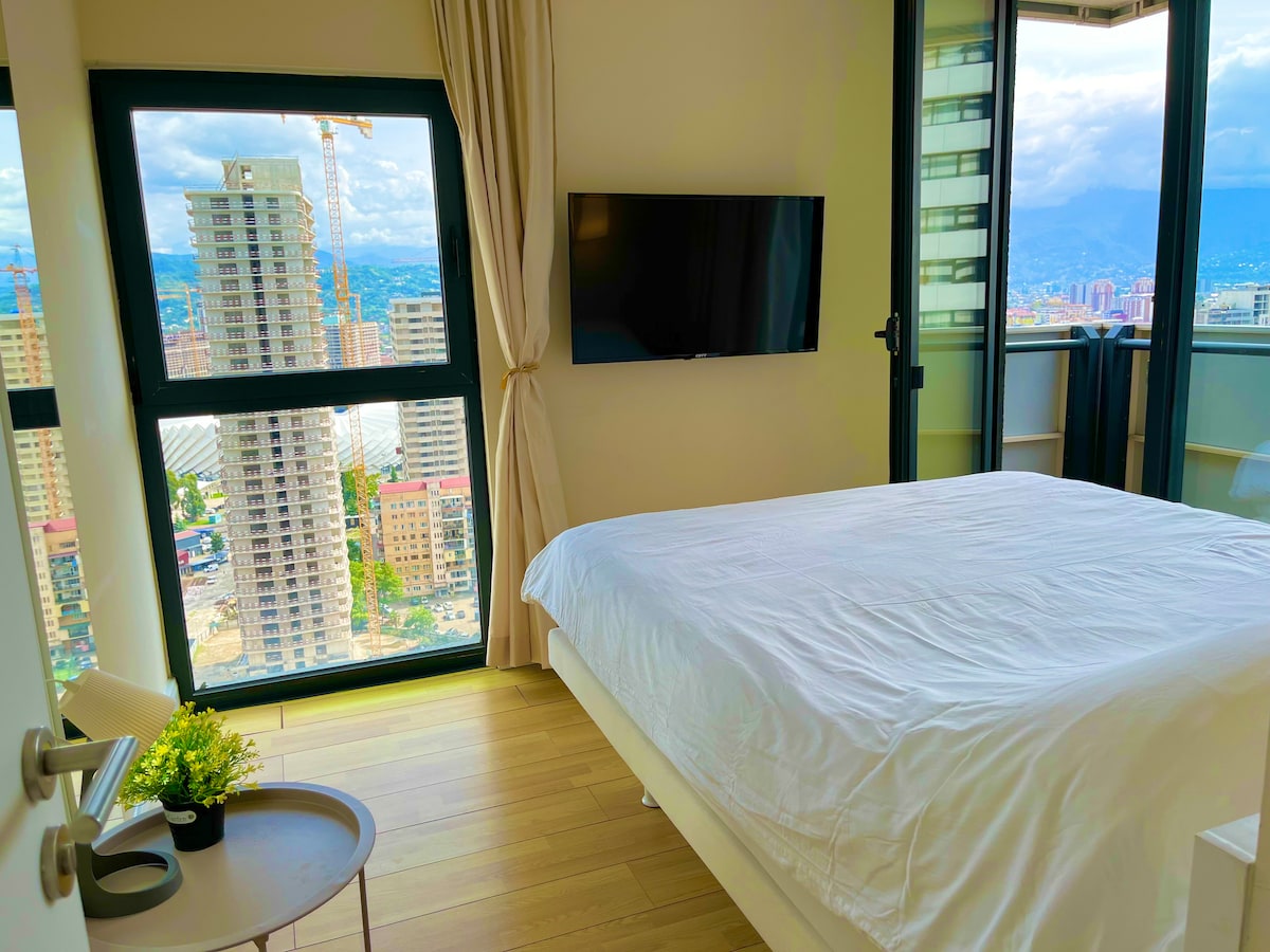 Apartemen kami berlokasi di gedung baru 12 lantai di lantai 11 dengan beranda besar dan pemandangan laut dan pegunungan yang menakjubkan. Rumah ini memiliki dua lift, tempat parkir gratis di halaman. Semua fasilitas,termasuk restoran,supermarket,apotek, halte bus berada di dekat rumah. Ada juga deretan toko sayuran di dekatnya, di mana setiap hari Anda bisa membeli keju Georgia segar, rempah-rempah harum, sayuran dan buah-buahan musiman. 6-8 menit berjalan kaki ada kereta gantung, dan jalan raya, area pesisir dan pantai berjarak 10-15 menit.