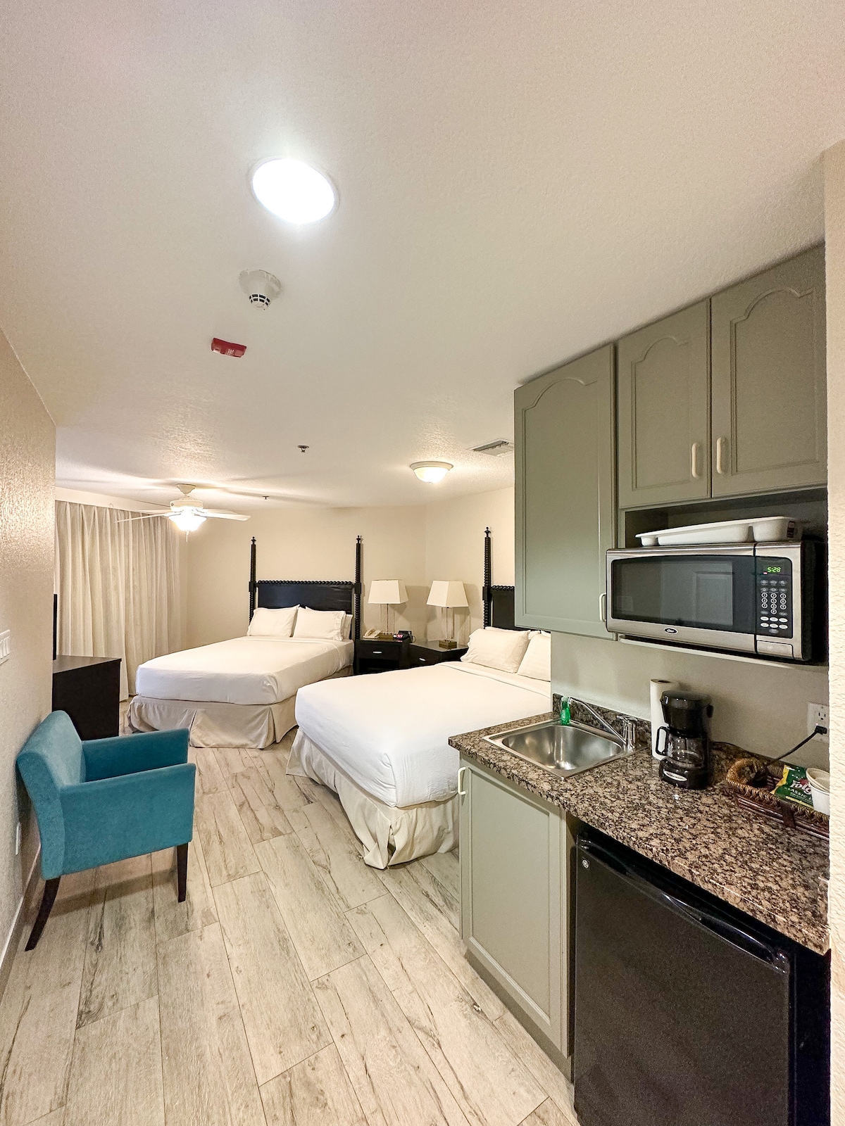 Ocean View- One Bedroom King Suite Spacious 900 sq. ft. suite with a private bedroom with king size bed and ensuite featuring a double vanity with walk-in shower. Includes a full kitchen, dining room, and living room with queen size sleeper sofa. Enjoy a private balcony or patio, flat-screen TV in bedroom and living room, in-room safe, coffee maker, microwave, full size fridge, oven, stove, iron, hairdryer, and more. Sleeps up to 4 adults or 3 adults and 1 child.