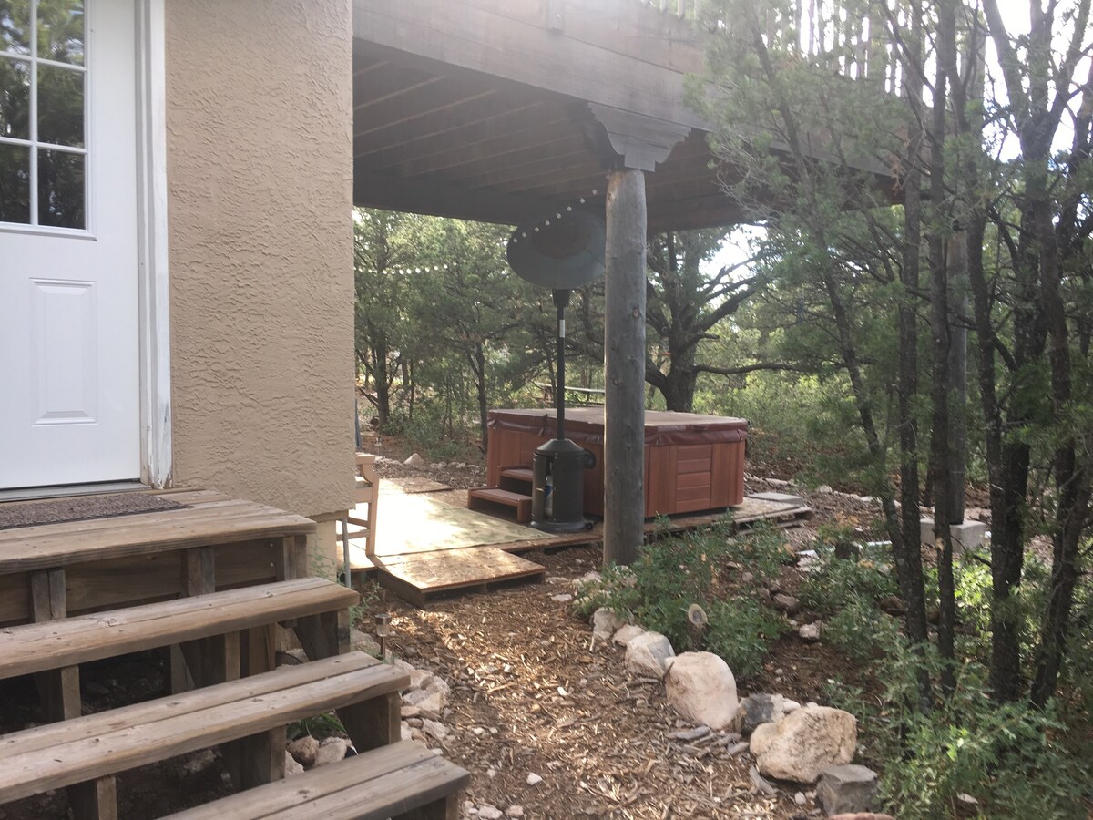 Mountain home berlokasi strategis 1 -40 dan 15 menit dari Albuquerque. Suite pemandangan pegunungan seluas 900 kaki persegi yang indah ini memiliki pintu masuk pribadi dari rumah utama. Nikmati tempat tidur queen size dengan area duduk yang menghadap ke hutan dan workstation. Sofa tidur berukuran queen menanti Anda beserta TV layar besar di ruang keluarga. Nikmati suara alam di teras Anda di samping Hutan Nasional Cibola. Bak mandi Deluxe dengan bak jet, dapur mini/bar, piano, permainan papan, dan perpustakaan untuk keperluan Anda.