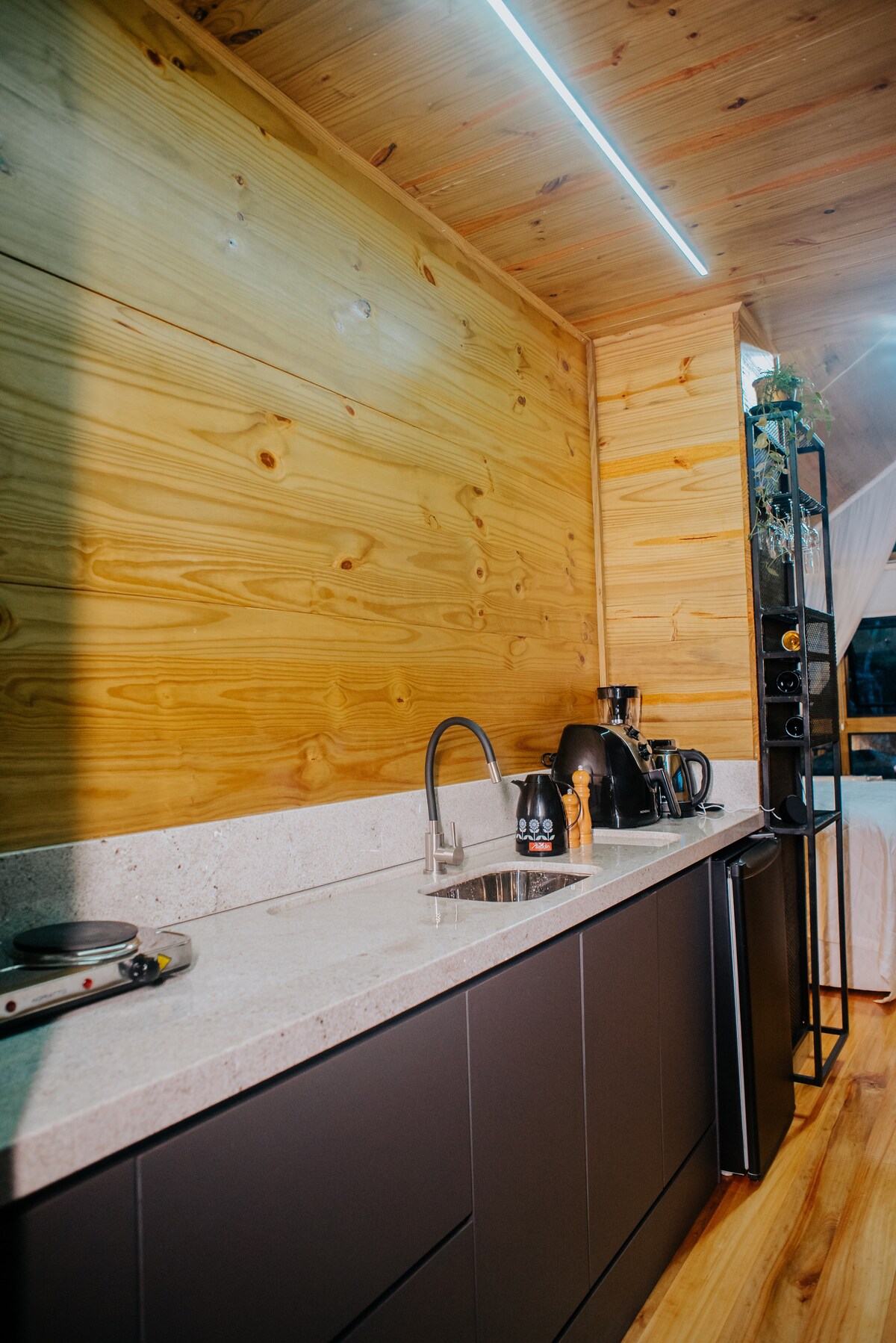 Relaxe neste espaço calmo e cheio de estilo. Prezamos por conforto tranquilidade e segurança aos nossos hóspedes. Trata-se de um quarto (suite) com uma pequena cozinha conjugada. Para maior conforto na sua chegada oferecemos itens básicos de cozinha (talheres prato xicara copo jarra elétrica e sanduicheira) também se preferir tomar um cafezinho basta apenas aquecer a àgua pois café e açúcar teremos disponível como cortesia da casa.