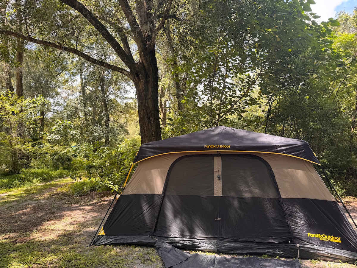 Unwind at Serenity Acres, your private glamping retreat, nestled amidst 10 acres of woods and fields. Enjoy Florida's cooler nights by the fire, and the warm sunny days. Our spacious 20' bell tent offers all the comforts of home, including a plush king-size bed, a cozy seating area, air conditioning, and heat. A full bathroom is located on the property for your personal use only, as tent guests. Shower under the moon with unlimited hot water! Relax at the fire, under the bright country stars!