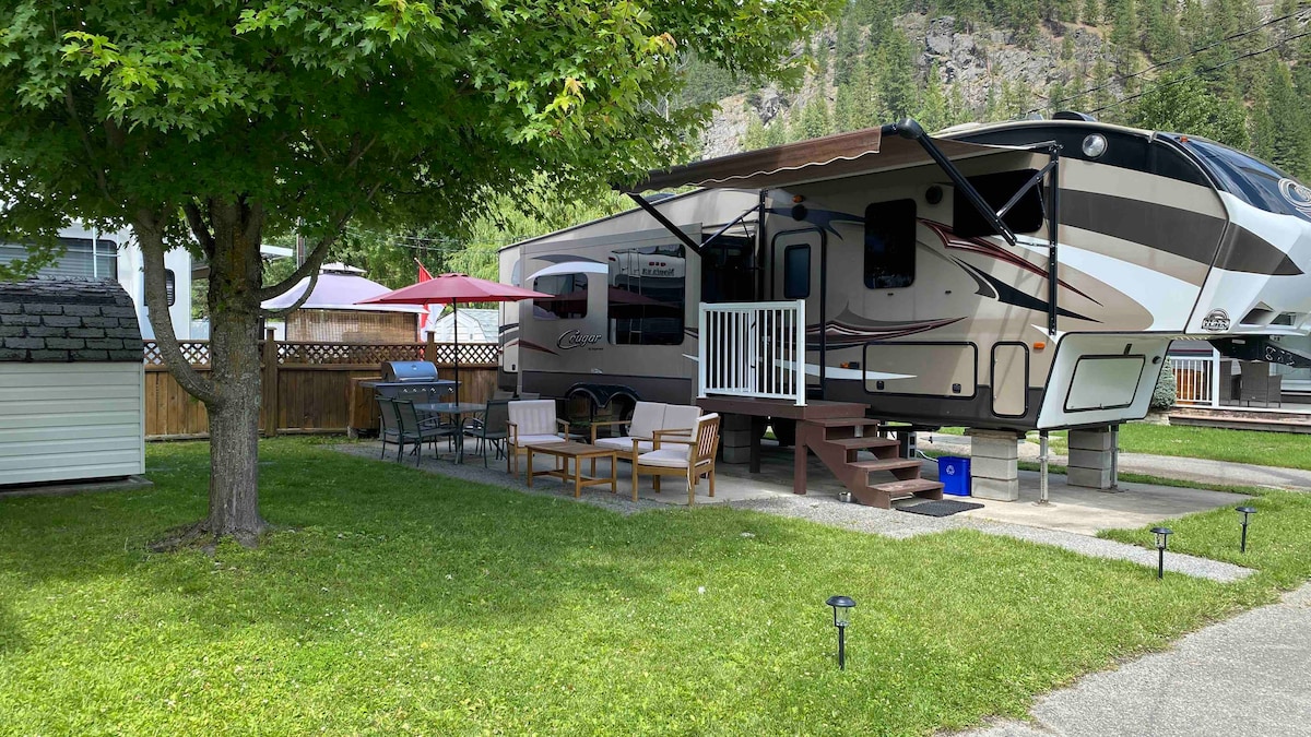 Sempurna untuk berlibur! Roda lima musim empat musim baru yang cerah dan nyaman terletak di pegunungan. Tempat ini berada di lokasi pribadi dan memiliki dapur lengkap, dapur luar ruangan dengan bar, kamar mandi dengan pancuran, tungku propana, TV 40", Netflix, wifi, perapian listrik, carport tertutup, dan dek besar. Anda juga akan menemukan bak mandi air panas berbahan bakar kayu yang dibuat khusus beberapa langkah dari pintu. Downtown Nelson berjarak 5 menit berkendara dan 20 menit ke Whitewater Ski Resort.