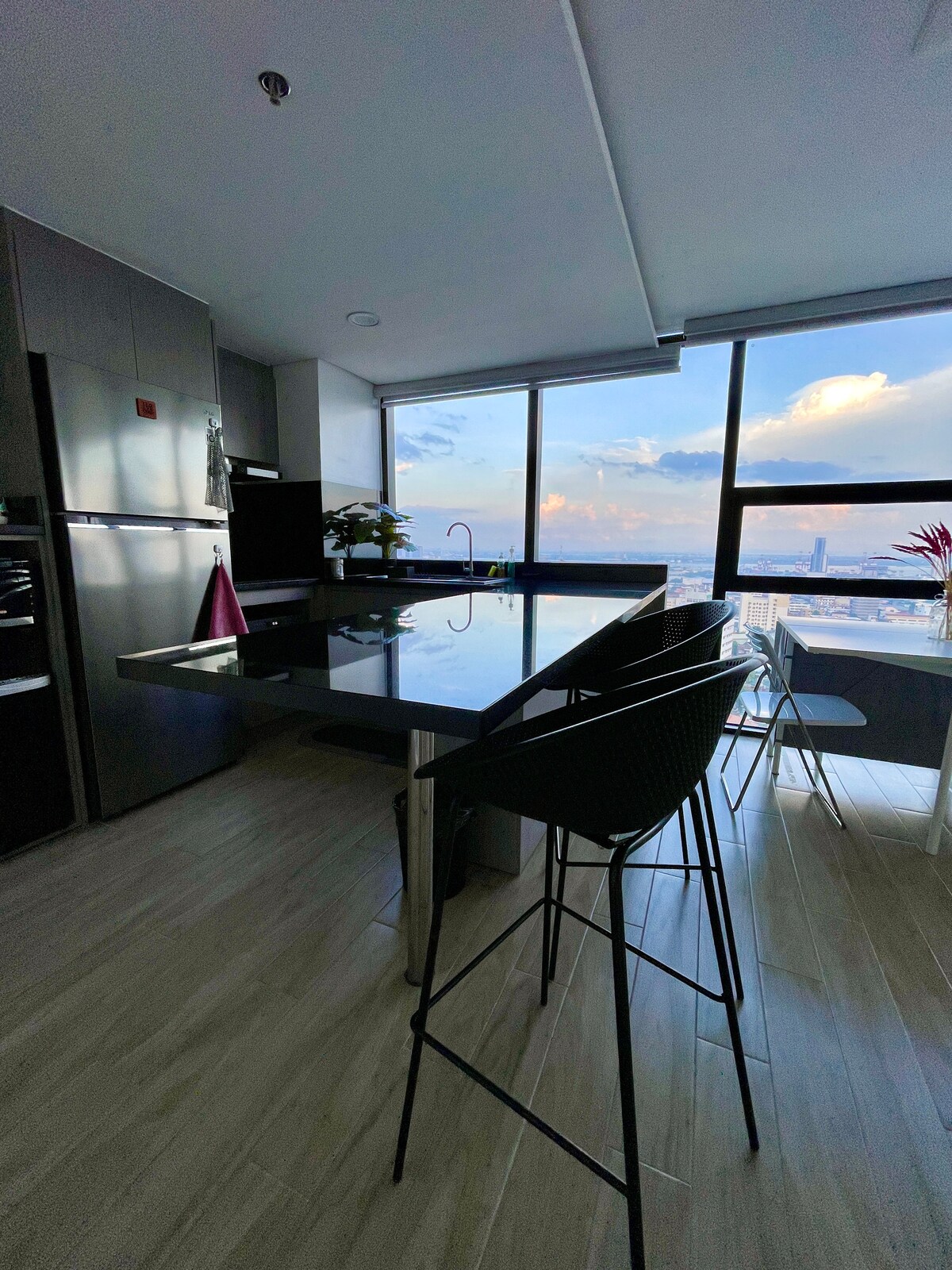 Kondominium mewah modern berbahan kaca dengan 2 kamar tidur, 3 kamar mandi, bergaya loteng di pusat Kota Cebu. Kamar tidur utama berupa suite dengan kamar mandi pribadi, tempat tidur king, dan TV layar datar. Kamar tidur ke-2 berupa kamar mandi dalam dengan bak mandi spa. Kulkas kaca DD, mesin cuci, ruang tamu memiliki jendela kaca seluas 16 kaki dengan pemandangan Kota dan pegunungan, sofa L besar, TV Samsung Smart 55” baru, Netflix, internet berkecepatan tinggi, area kolam renang $2 per orang dewasa. Fasilitas gym dan parkir di lokasi dikenakan biaya tambahan. Catatan: Akhirnya, semua masalah listrik di gedung ini terselesaikan.