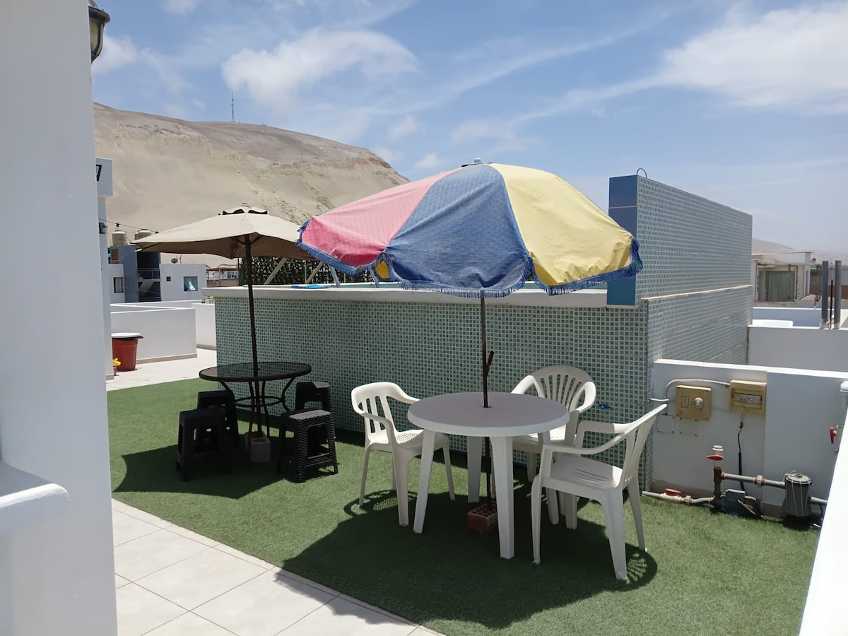 Relájate en la zona más exclusiva y tranquila de Camana con toda la familia Con amplia playa con Warachas separadas para conservar tu intimidad. Diferentes vistas al mar desde 1er piso y desde una gran terraza. Frente al parque para que no se alejen los niños. Además de disfrutar de la piscina.