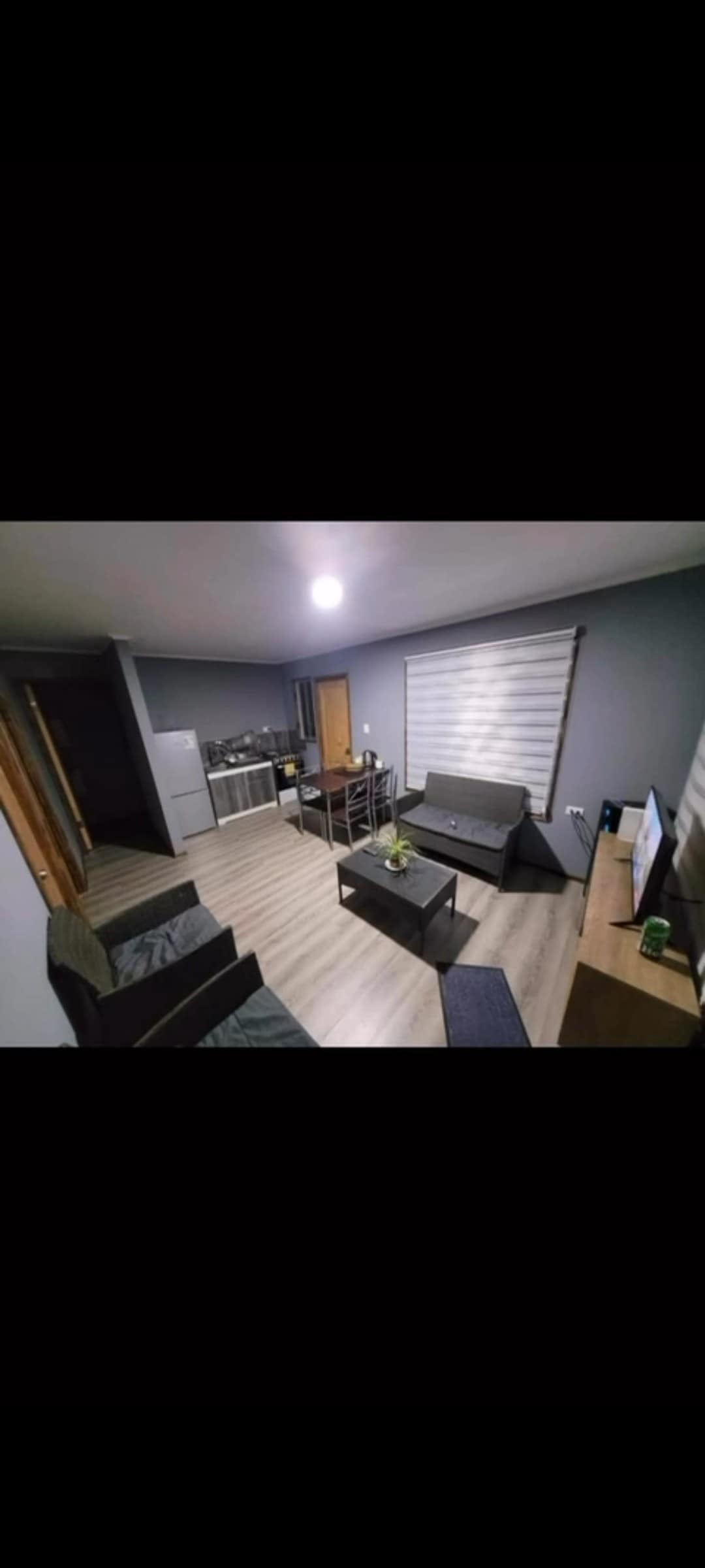 departamento cuenta con una cocina equipada : vasos, cubiertos, platos, tostador eléctrico, sandwichera, hervidor, cocina con horno y refrigerador, sartenes y ollas. living es acogedor, muy cómodo, alfombra y decoración agradable. Además, hay un calefactor eléctrico Habitación dispone de una cama de dos plazas un cubrecamas muy calentito, televisión, closet con espacio para dejar tus pertenencias. El baño cuenta con tina y agua a una temperatura agradable,