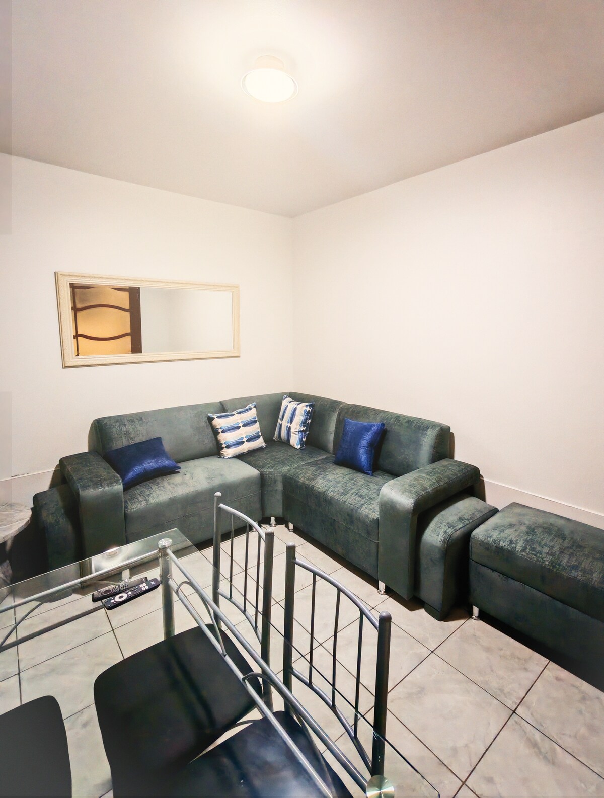 Este acogedor y moderno departamento de 3 habitaciones, está diseñado para que disfrutes al máximo tu estadía. Sala luminosa con sofá cómodo y TV de 65’ para tus tardes de relax. Medio baño de visitas Comedor con amplia mesa para compartir una cena en armonía. Cocina completamente equipada con todos los utensilios. Cama king size para un descanso placentero, TV 55’. Baño privado. 2 habitaciones con camas de 2 plazas súper cómodas y 1 de ellas con TV. Baño compartido.