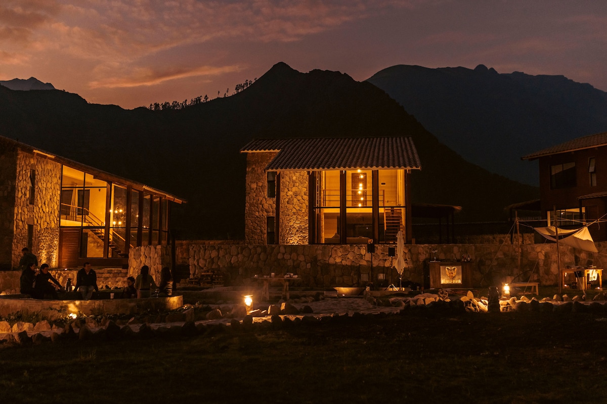 Nikmati vila eksklusif yang terletak di lereng bukit Apu (bukit) ini, dengan salah satu pemandangan Lembah Suci Inca yang paling spektakuler. 1 1/2 jam dari Cusco dan 1/2 jam dari Ollantaytambo - stasiun Machu Picchu. Kami memiliki kapasitas hingga 12 orang, 4 kamar tidur, 4,5 kamar mandi, dan teras besar untuk dinikmati bersama teman atau keluarga. Rumah ini juga memiliki perapian, pemanggang, dan perapian eksternal; selain berbagai lingkungan yang penuh dengan detail cinta, alam, dan seni.