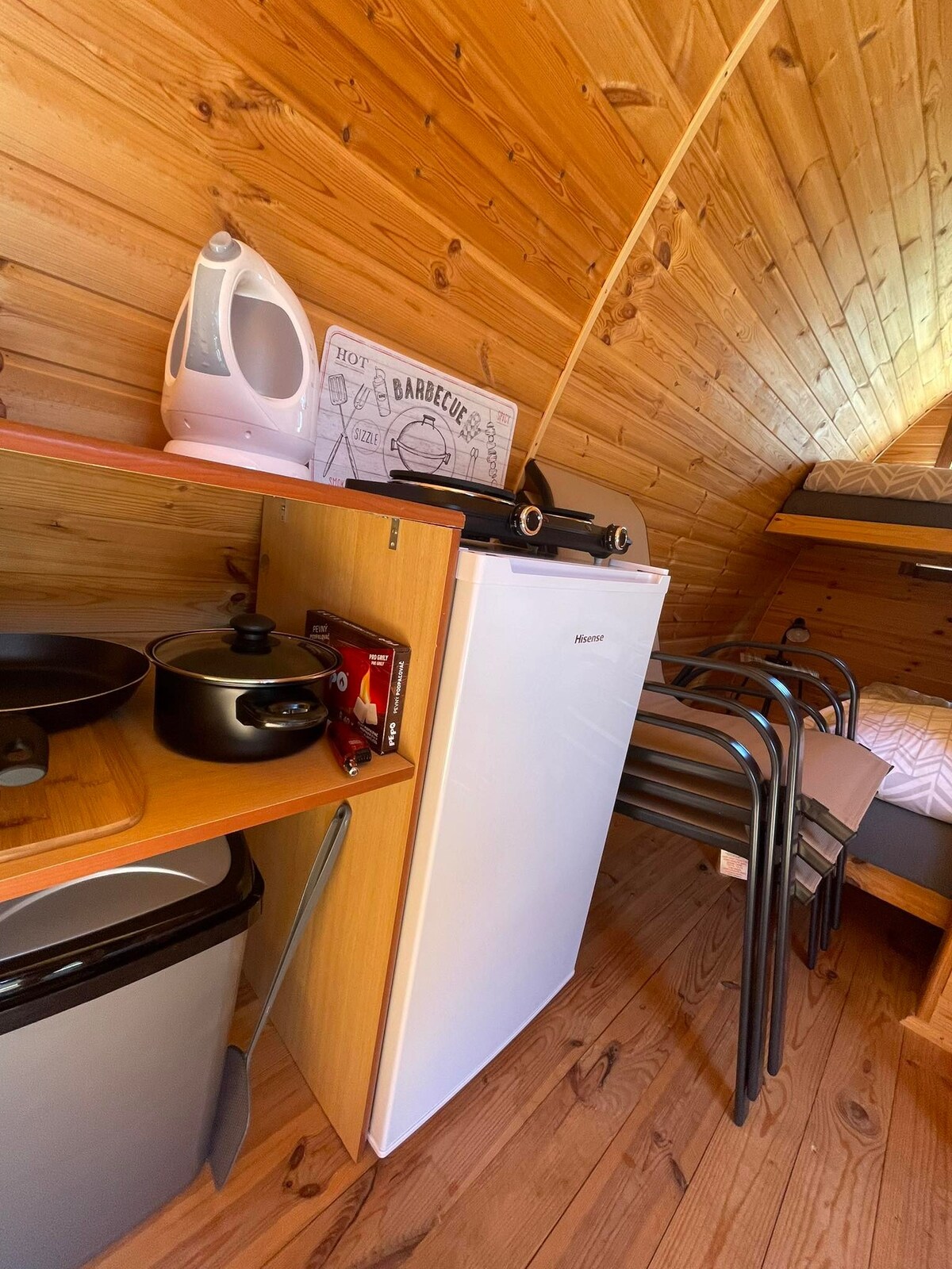 Rumcajs sebagai TinyHouse pulau penuh menyediakan semua kenyamanan berupa pancuran air panas, toilet, kulkas, tetapi juga AC. Interior kayu penuh yang beraroma segera setelah masuk. "Meja terbang" menyesuaikan diri dengan setiap tempat duduk. Tirai luar ruangan akan menyembunyikan Anda dari dunia jika Anda mau. Pencahayaan pintar hanya menyala di tempat-tempat tertentu saat Anda membutuhkannya. Pemanggang luar ruangan di teras, kayu kering dengan kapak dan sauna kayu dengan tong pendingin.