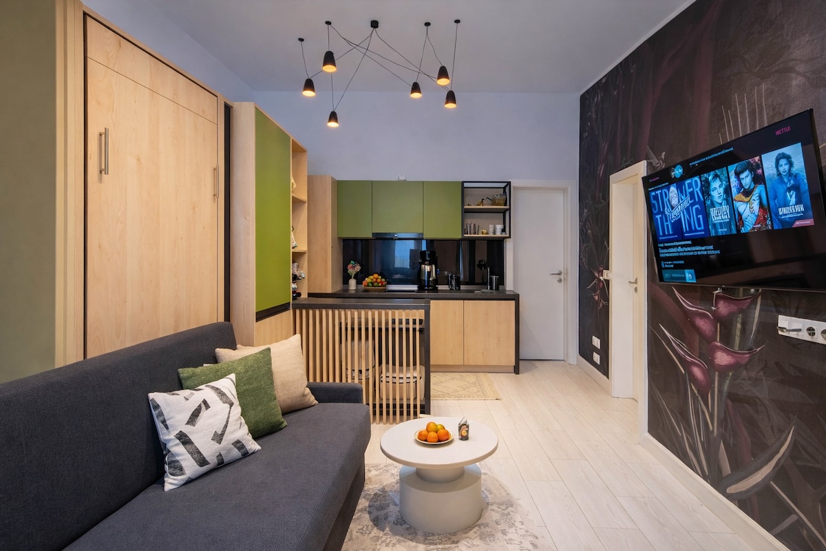 Apartemen Studio Vintage di pusat kota dengan taman, pusat perbelanjaan, kopi enak, dan stasiun bus di dekatnya. Apartemen ini terletak di gedung baru, dengan lift. Check - in mandiri juga tersedia untuk tamu kami. Lingkungannya sangat ramah dengan kemungkinan parkir berbayar Baik Anda berada di sini untuk bersantai atau bekerja, tempat ini akan sangat mengakomodasi setiap kebutuhan Anda!