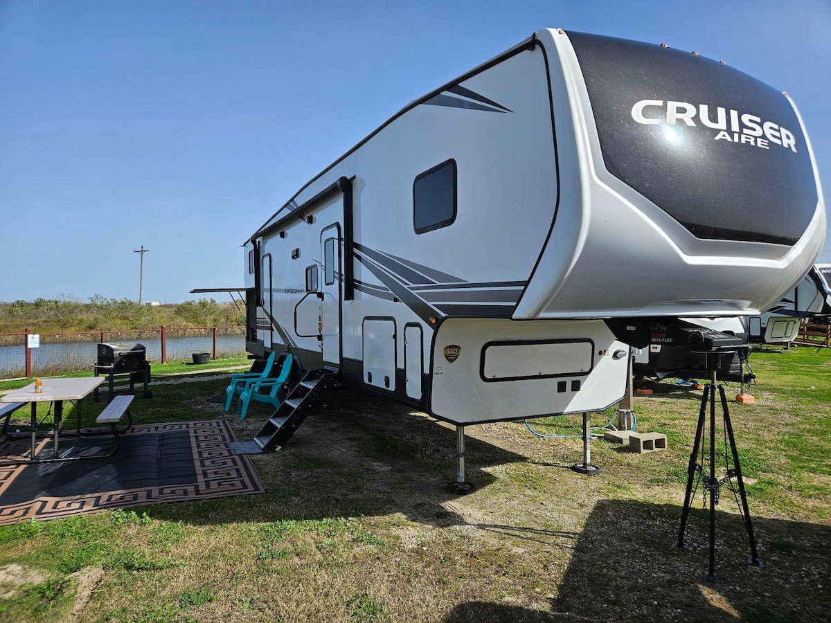 Family Bunkhouse RV w/ Canal Views | Near Crystal Beach | Sleeps 7 Perfect for families, this spacious Cruiser Aire RV features a private queen master bedroom, bunk room for kids, cozy fireplace living area, and peaceful canal views just minutes from Crystal Beach. This two-bedroom Cruiser Aire 5th wheel offers a comfortable coastal retreat for families and groups. Located along a tranquil canal with views toward the Intracoastal Waterway and the Gulf, the RV provides a relaxing environment wi