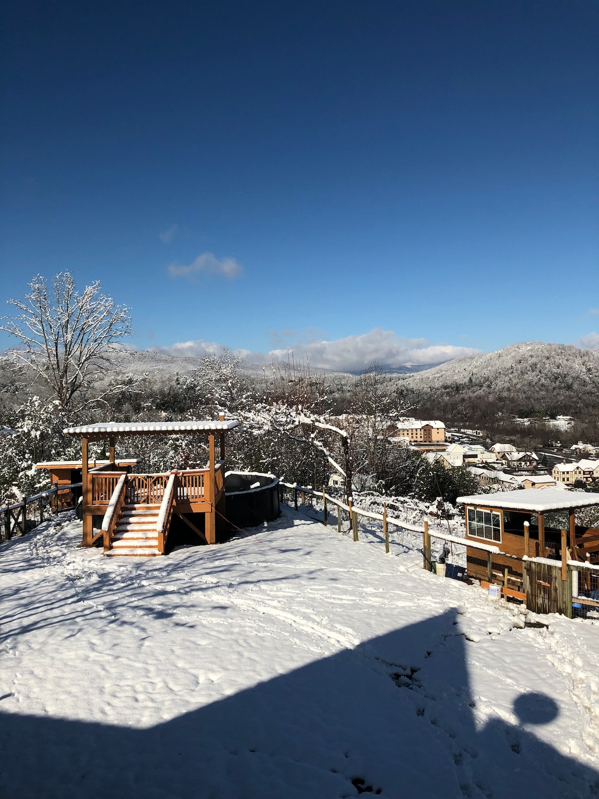 Kabin Nyaman dengan Pemandangan Gunung dengan Perapian + Bak Mandi Air Panas
