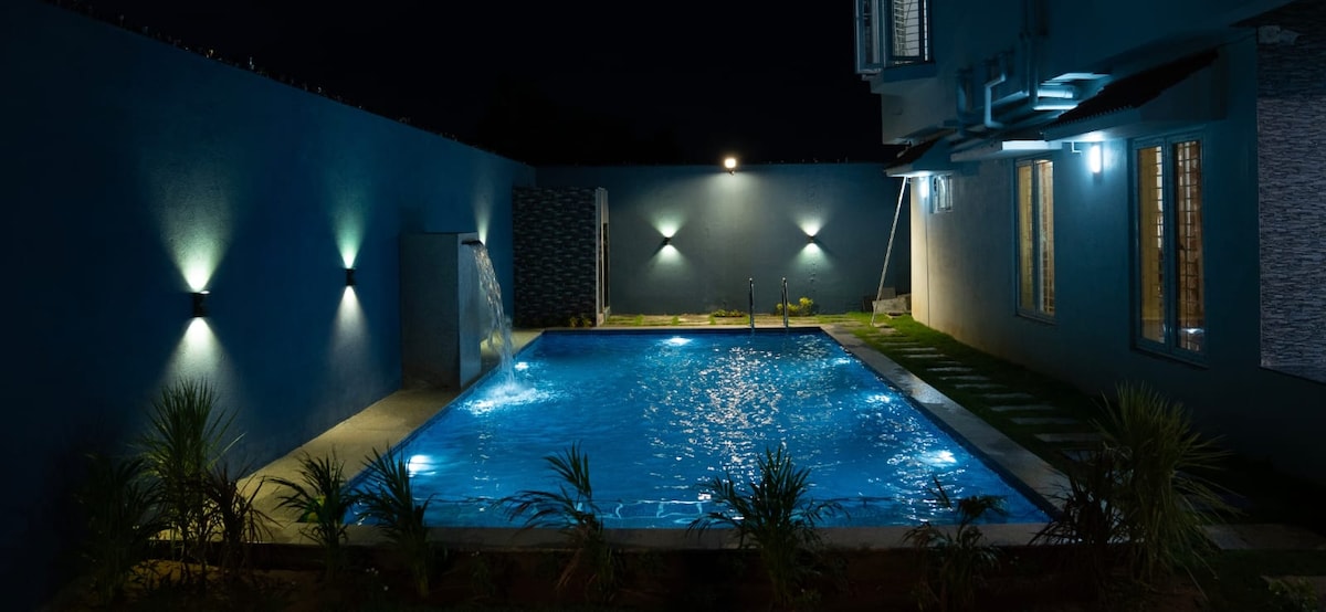 Make some memories at this unique and family-friendly place to enjoy. Less than 1000 meters from Sea, Back water in 200meters. Pvt swimming pool with water falls. Garden 24hrs Staffs and CCTV. Excellent night atmosphere. Max. up to 16 Guests can be accommodated. Outdoor projector, Wifi, JPL Speaker. BBQ and camp fire facility kitchen facilities for self cooking, if required our caretaker will provide home made food with minimal charges. .