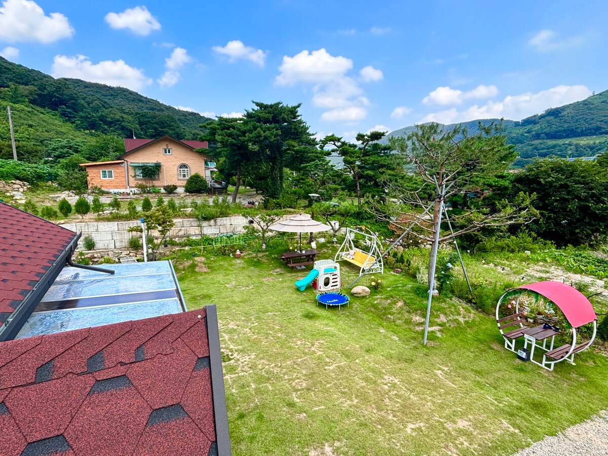 Rumah keluarga tunggal ini telah direnovasi dari rumah dua lantai, dan Anda bisa menikmati suasana rumah liburan. Keuntungannya adalah hanya satu tim yang bisa memesan per hari. Lokasi/Transportasi: Berjarak 15 menit berjalan kaki dari Terminal Bus Antar Kota Sungnisan dan 3 menit berkendara. Biaya taksi dasar sebesar 4.000 won berjarak 5 menit berjalan kaki, dan terdapat aliran lembah dengan naungan pohon yang ideal bagi anak - anak untuk bermain di air. Fasilitas: Dek yang luas, payung, barbekyu arang (arang disiapkan dan tidak ada biaya tambahan) Kamar tidur: 1 kamar tidur queen, 2 kamar ondol, toilet kamar mandi di setiap kamar, pengering rambut, handuk, sampo, pasta gigi, sabun, tisu toilet Kulkas, microwave, pembuat kopi, rice cooker, peralatan makan, cangkir, sendok dan sumpit, gelas anggur. Minyak goreng, garam, gula tamasya: Ada pintu masuk tempat Anda bisa mendaki injeksi legal, Sejo - gil, Sejogil, dan Puncak Cheonwangbong dalam jarak 10 menit berjalan kaki. * Hingga 10 orang ke ruang tamu. 20.000 won untuk satu tambahan orang. Satu anjing gratis. 10.000 won per anjing tambahan. Namun, untuk lebih dari 10 kilo, 20.000 won tanpa gratis. * check - IN: 3 sore check - out: 11.00 * Dapat disesuaikan *