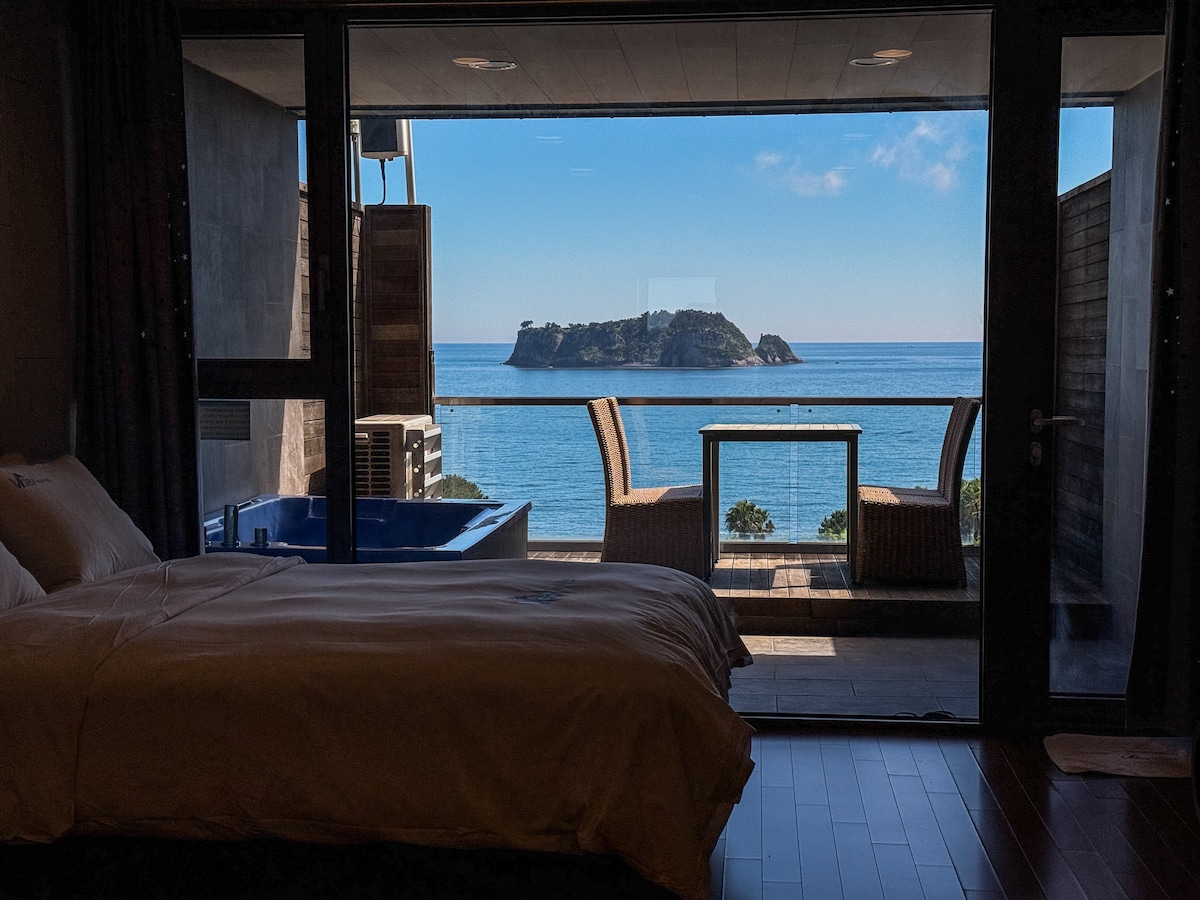Hello. Perched on a cliff in central Seogwipo, this suite offers ocean views where islands and sea meet on one horizon. The 66㎡ private space keeps you apart from other travelers. Studio-style, yet spacious, with separate bedroom, living, and kitchen zones for an easy flow. On the terrace, soak in the spa and enjoy a private barbecue above the water. Free breakfast served with wide sea views. May to October, swim in the infinity pool facing Beomseom. The rooftop garden captures Jeju sunsets.