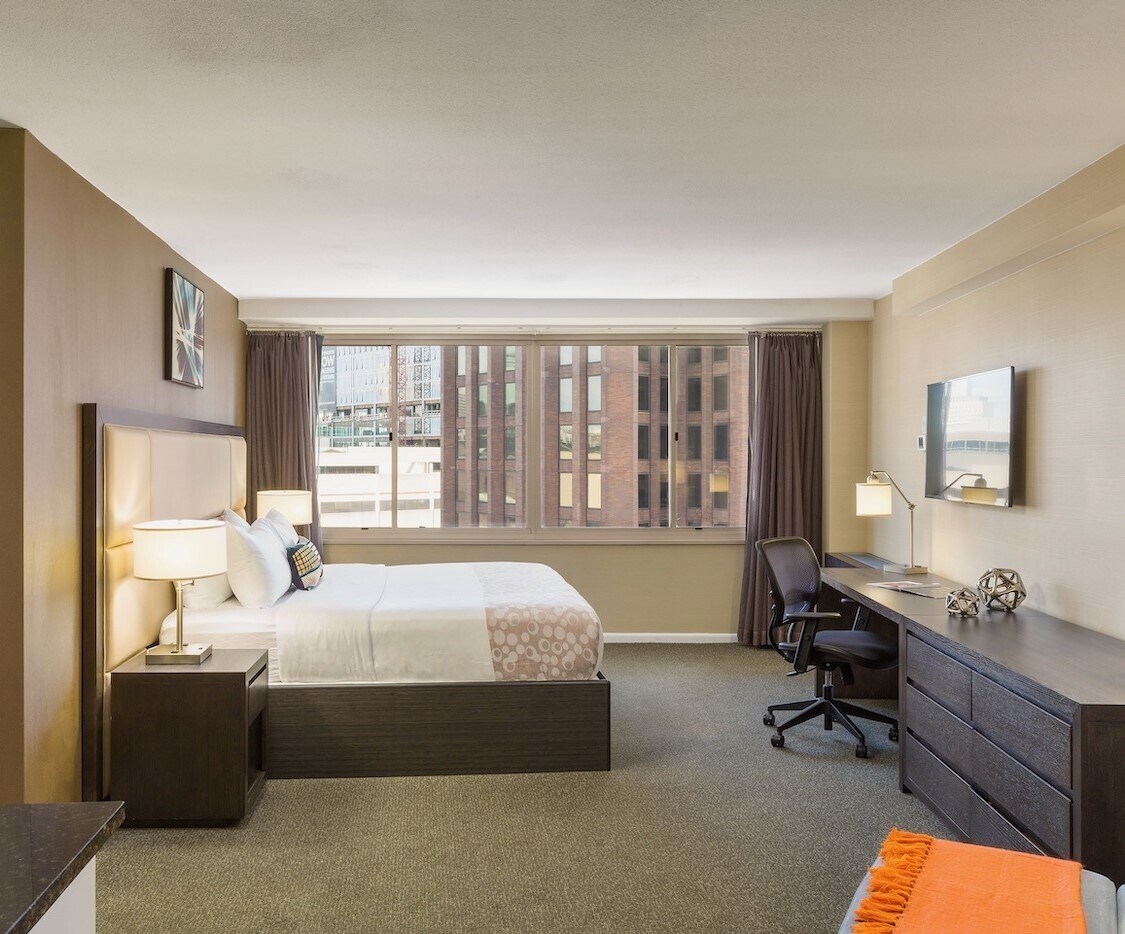 Indulge in 450–500 square feet of contemporary comfort, featuring a plush king bed ideal for up to two guests. Enjoy a spacious, thoughtfully designed studio with modern amenities—perfect for unwinding and recharging in the heart of the city.