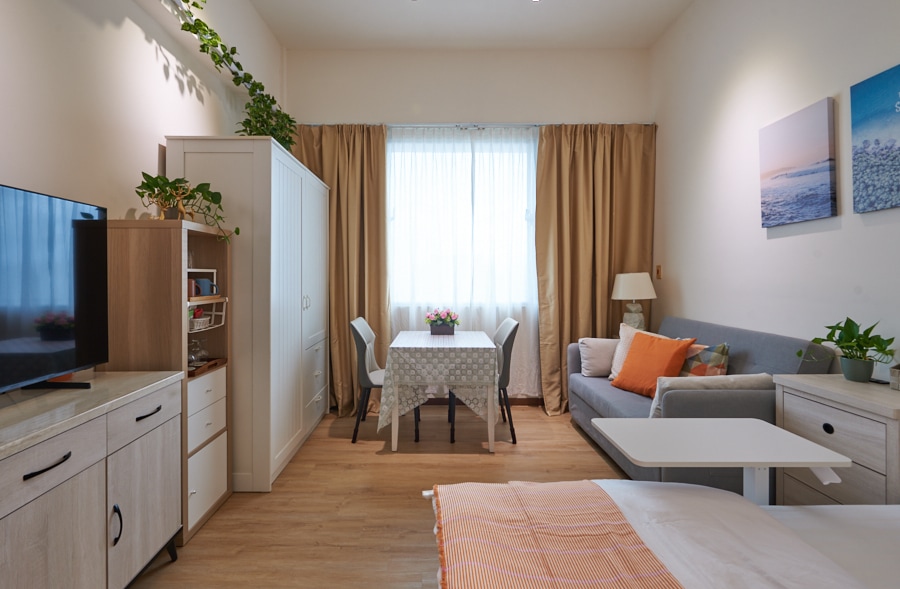 室內的灰白主色,配搭北美木紋銅色傢俱及家飾, 用心為您的居住空間提供沈靜優雅的感覺。日韓系電器的選用,不論是無線充電藍牙喇叭 ,大螢幕伸縮高清電視 ,都能滿足您對影音效果的要求。房源位於高樓內縮樓層,阻絕不必要的噪音並滿足您對景觀 ,安靜及隱私的要求。大樓並配有全天候警衛,住戶專屬電梯 ,公用大露台 ,以及地下收費停車場, 位處西門町核心路段,無論搭乘捷運或自駕都非常方便。Desain interior berbasis nada bumi menawarkan suasana yang hangat, tenang, penyembuhan, dan menyenangkan. Fasilitas kamar, termasuk tempat tidur ganda, kamar mandi dalam dengan shower enclosure, AC, smart 4K TV dengan film/Netflix, internet WIFI, pencahayaan teluk dan pemutar musik dengan koneksi nirkabel & port pengisi daya USB.