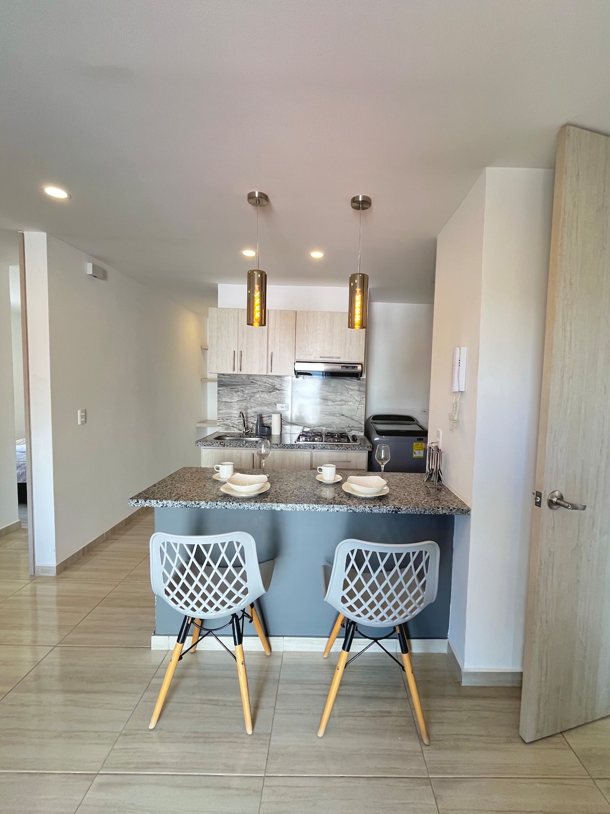 Este es moderno apartaestudio está ubicado Cañaveral, una zona central del area metropolitana de Bucaramanga. Cuenta con una bella sala, una barra tipo bar y cocina totalmente equipada. Los huéspedes disfrutarán de un hermoso balcón con vista a una reserva natural. La habitación cuenta con una cama cómoda, además la sala dispone de un sofácama confortable. El baño es moderno. El edificio cuenta con piscina, sauna turco y gimnasio. La ubicación es excelente, con tiendas, restaurantes y CC cerca.
