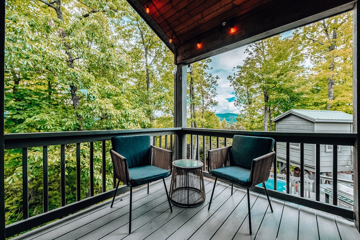 Liburan mewah di puncak bukit dengan bak mandi air panas dan perapian. 3 King Suite, 1 Kamar tidur Queen, 1 Futon Queen, dapur Chef, tidur 10. Keluarga menyukai meja biliar, permainan papan, dan halaman belakang yang luas untuk dijelajahi anak-anak. Kursi Makan Bayi dan PackNPlay siap untuk si kecil Anda! Beberapa menit dari tempat lintas alam dan restoran lokal—kembali ke rumah untuk menikmati s'mores di dekat api unggun saat matahari terbenam. Pesan sekarang untuk mengamankan tanggal Anda! Chimney Rock dan Chimney Rock State Park TERBUKA! Danau akan dibuka lagi pada bulan Mei 2026!