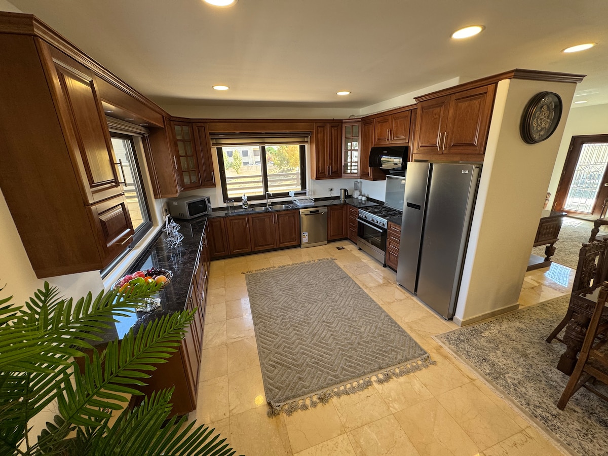 Apartemen kamar tidur ganda lantai dasar; 90 meter persegi di dalam ditambah taman pribadi seluas 80 meter persegi. Dapur lengkap. Ruang tamu yang nyaman dengan jendela geser sinar matahari langsung yang terbuka ke Taman. Layar melengkung besar dengan langganan Netflix. Taman luas, bisa menampung resepsi, tersedia stasiun bbq. Memiliki akses langsung ke Main Street, memiliki akses ke patio kolam renang yang luas. Area sangat tenang, terletak di lokasi strategis dekat kawasan perbelanjaan Sweifiyeh.