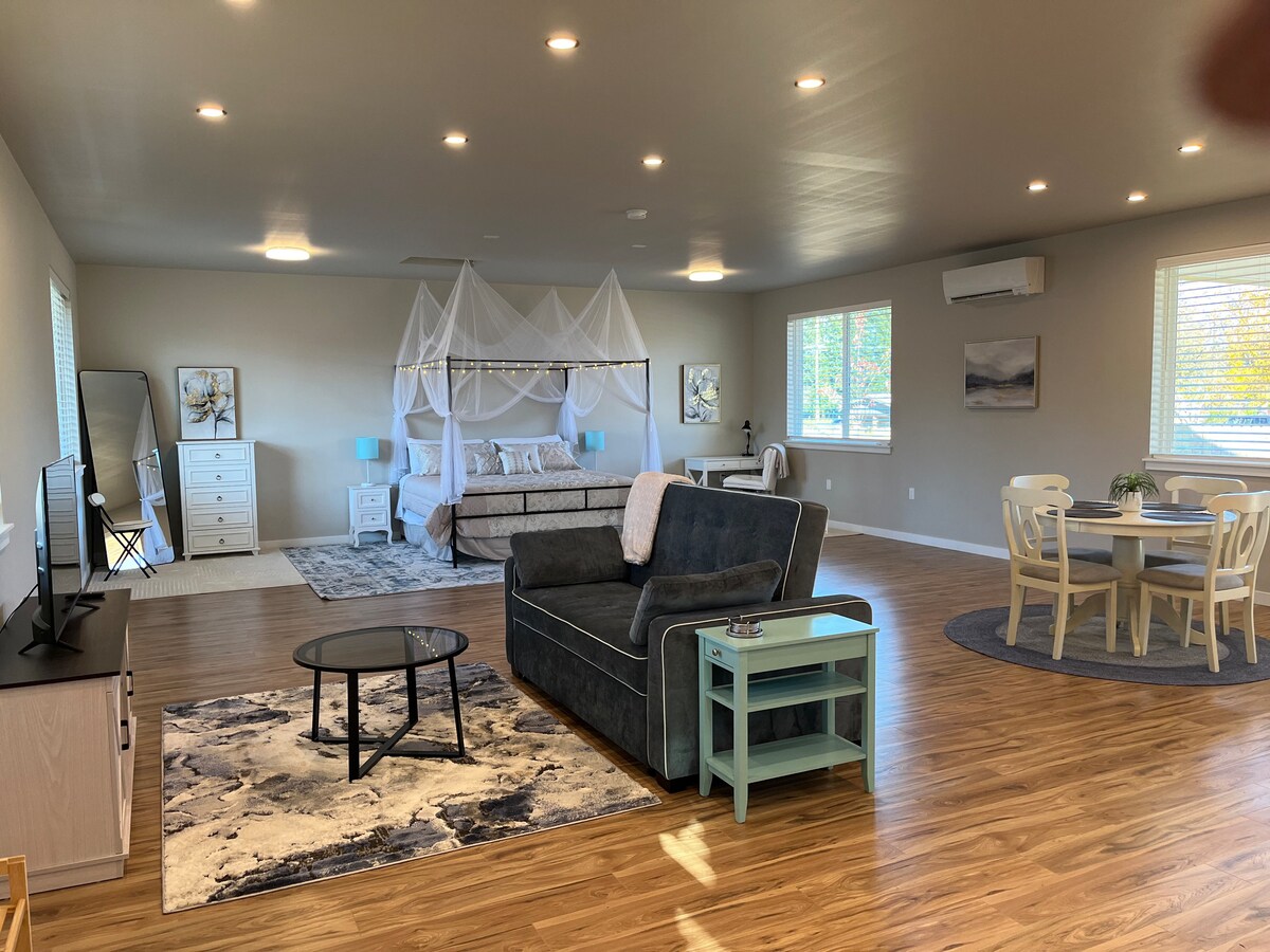 Apartemen studio seluas 400 kaki persegi ini cerah dan lucu, hanya beberapa menit dari pusat kota Port Angeles di lingkungan perumahan yang tenang. Kami memiliki pengisi daya mobil listrik untuk digunakan tamu (steker J1772). Area tempat tidur terdapat tempat tidur queen. Ada dapur kecil termasuk kulkas, microwave, kopi, dan pemanggang roti (tanpa kompor). Terdapat kamar mandi lengkap dan area duduk. Dek yang cerah dan bak mandi air panas taman adalah fasilitas ekstra yang luar biasa.