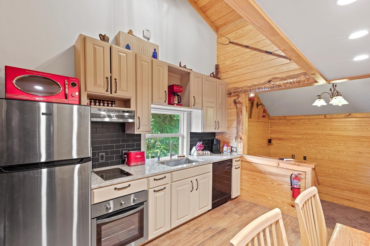 I spent 2 years custom building this apartment to be used exclusively as an Abnb rental. It was handcrafted using tongue & groove pine milled here in AL. All of the oak/pine used for the trim, cabinet doors, and custom furniture were milled in VA using my stepfather's personal sawmill with lumber harvested both from my property here in AL, and my families property in VA. Even the door/drawer pulls and switch/outlet covers were hand forged in PA by an Amish guy at his home forge in his basement.