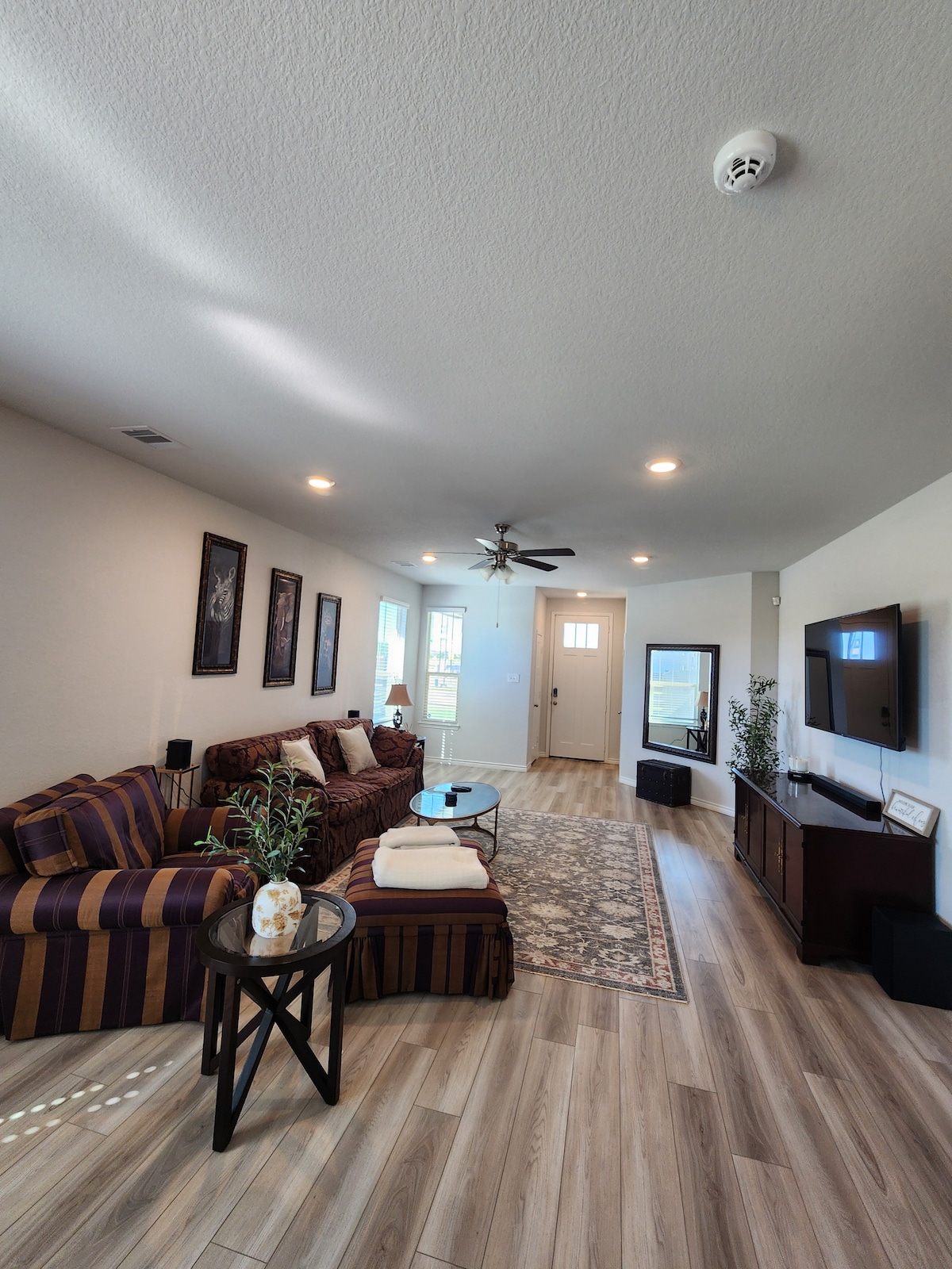 Relax in a brand new "Mid Century Modern" townhome located in the Historical Downtown Bryan & in walking distance to Ronin, Black Water Draw, RX Pizza, the Village, Cilantro & many more Restaurants. Master bedroom has a king sized bed & each room has 58 plus Smart TV.. Log into your personal streaming account or use our Hulu, Disney or ESPN, as a courtesy. Relax in private backyard with a beautiful view or cook in the beautiful kitchen which includes a Keurig coffee maker with pods & creamers.