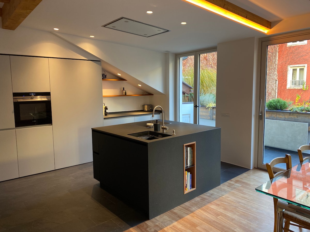 Loteng bergaya, cerah, dan nyaman ini telah dirancang ulang sepenuhnya untuk iklan modern yang nyaman. Langit - langit putih yang tinggi, lantai kayu, perabotan buatan tangan, pemanas terpadu, TV layar datar, dan Wi - Fi sangat cocok untuk pasangan atau individu yang berkunjung ke kota ini! Bangku yang kokoh dapat diatur sebagai tempat tidur sofa ganda. Lokasinya luar biasa: sangat sentral dan sekaligus di area eksklusif yang tenang di depan Taman Talvera; 15 menit berjalan kaki dari Stasiun Bolzano. Check - in mandiri.