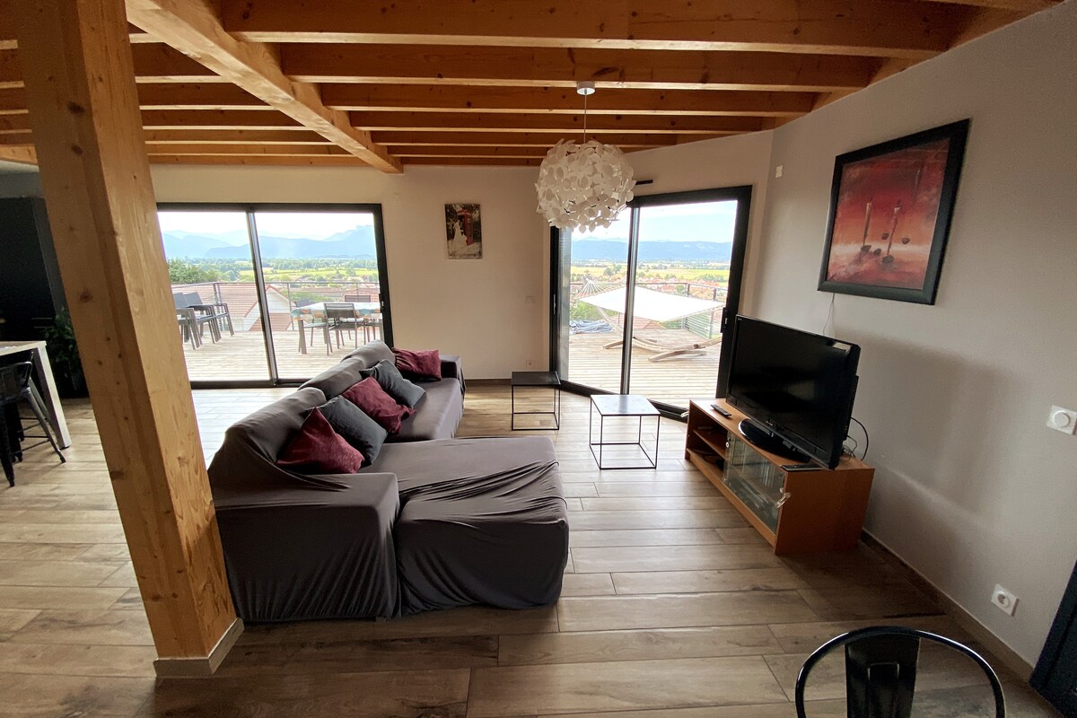 Chalet! Dengan taman seluas 3250 m2 yang tertutup sepenuhnya dan dihiasi pepohonan yang indah. Wifi gratis dan AC!!! dapur terintegrasi LV. Kompor kayu, 2p sofa bed, TV, walk-in shower, pengering handuk dan mesin cuci, cha. Tempat tidur berkualitas berukuran 140x190. teras dengan meja dan kursi, perabot taman, tempat tidur matahari, hammock, kursi ayunan, pancuran luar ruangan, barbeku, pétanque, meja ping pong, dart. 1 jam dari Lyon,Grenoble, Chambéry, dekat dengan jalan tol A48, charavines Lac de Paladru 15 m