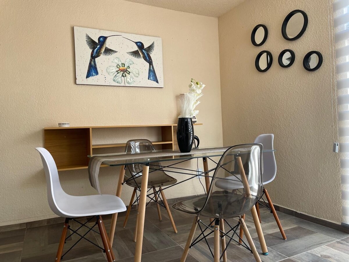 Apartemen modern dan sepenuhnya mandiri, terletak hanya 7 menit dari Bandara Internasional Toluca dan dekat dengan kawasan industri. Cocok untuk wisatawan, beristirahat, atau menginap untuk bekerja. Tempat ini memiliki dua kamar tidur dengan tempat tidur ganda dan lemari, kamar mandi lengkap, ruang tamu dengan TV, ruang kerja yang sempurna untuk bekerja, ruang makan, dan dapur lengkap dengan kulkas, microwave, blender, dan pembuat kopi. Garasi untuk satu kendaraan. Semua siap untuk membuat Anda merasa seperti di rumah!