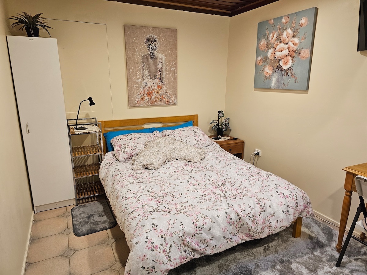 Nikmati kenyamanan pintu masuk pribadi Anda sendiri ke kamar mandi yang nyaman dengan ruang kerja dan dapur kecil. Kasur Tempur dengan tempat tidur yang dapat direbahkan sangat cocok untuk membaca dan mengangkat kaki Anda. Pemandangan taman yang damai dan ruang luar ruangan dengan tempat parkir tertutup yang aman. Lokasi sangat nyaman! 6 menit berkendara ke bandara & 3 menit ke jalan bebas hambatan. 2 menit berjalan kaki ke halte bus, restoran, toko kelontong, pub, dokter, penata rambut, cucian, dan sungai serta jalur sepeda di depan pintu Anda