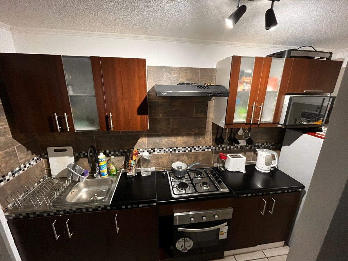Apartemen satu blok dari supermarket Líder dan 2 blok dari Jumbo, dengan tempat tidur double di kamar tidur utama, 2 kamar tidur lainnya juga memiliki tempat tidur, dilengkapi dengan ruang tamu, ruang makan, mesin cuci dan pengering, dapur berperabot 100% dengan semua peralatan memasak. Semua furnitur bergaya vintage. Tempat ini memiliki tempat parkir + Wi-Fi + TV kabel + Netflix dan Amazon Prime. Di kamar mandi Anda akan menemukan sabun, sampo, kondisioner, handuk bersih, dan pengering rambut.