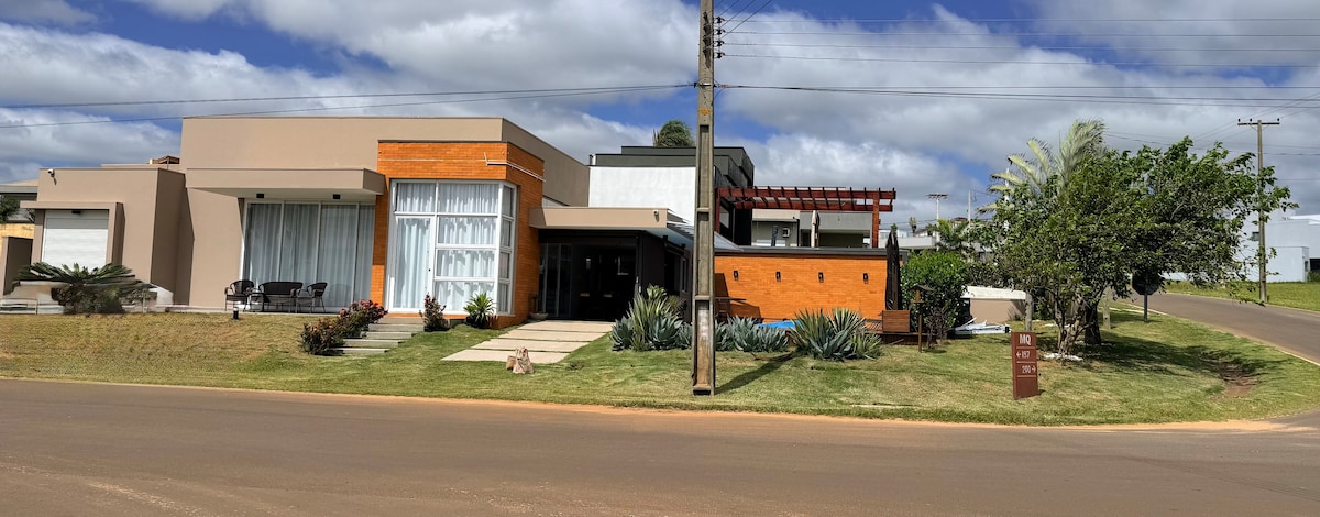 Rumah yang luas, di tepi bendungan, dalam komunitas yang hanya memiliki 28 lot. Sebuah proyek yang dilakukan oleh Ambienta Arquitetura (prestisius oleh majalah Arquitetura e Construção dan lainnya) dengan lahan seluas 3.900 m2, dibangun 516m2, kolam renang standar, dan kolam renang berpemanas yang lebih kecil (pemanas listrik), trampolin, slackline, kayak, dayung berdiri dan barbekyu. 5 suite (semua dengan AC) dan toilet lain. Kapasitas untuk menampung 14 orang dengan nyaman ditambah bayi.