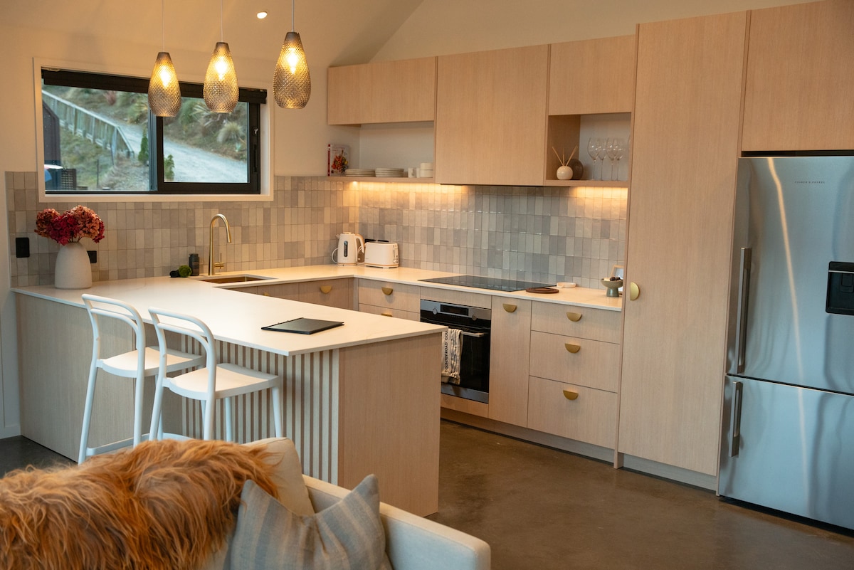 Tempat tidur king yang nyaman, pemandangan menakjubkan dari ketinggian, seprai mewah, proyektor besar dengan Netflix melalui perangkat Anda & wifi cepat/tidak terbatas. Dapur lengkap dengan kulkas/freezer berukuran lengkap, pencuci piring, oven, kompor induksi 4 burner & BBQ. Mesin cuci & kamar mandi berkeramik yang menakjubkan. Dirancang untuk pasangan. Nyaman, bergaya, tenang, pribadi & romantis. Baru & sengaja dibangun, mewah, dirancang dengan cermat & berkendara singkat ke pusat kota. AirCon/kipas angin langit-langit untuk membuat Anda tetap sejuk di musim panas. Api kayu untuk malam musim dingin yang nyaman.