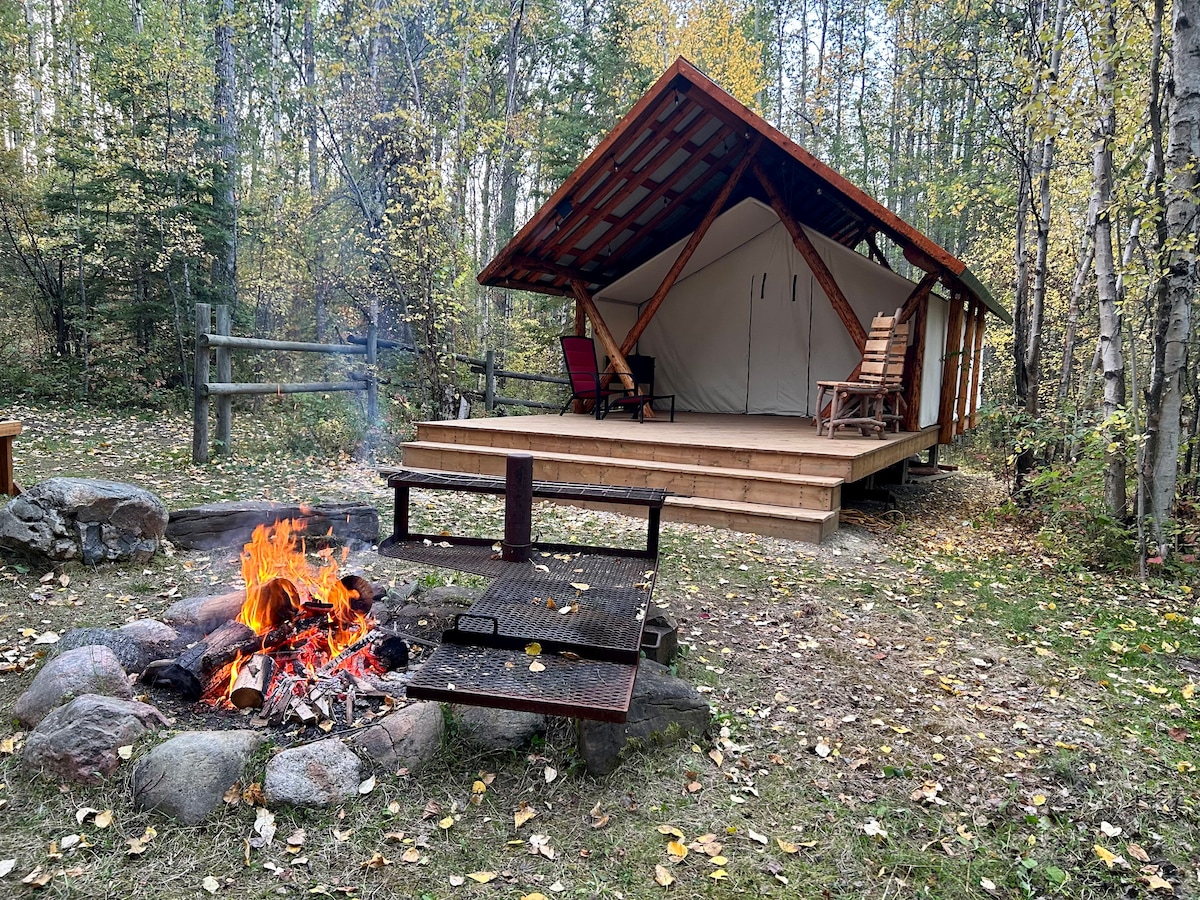 Benamkan diri Anda dalam pelarian alam liar sejati dengan Rustic Wilderness Retreat kami yang berada di luar jaringan, tempat ketenangan pedesaan mengelilingi Anda di Outfitter's Tent yang nyaman dan berperabot di tepi sungai. Nikmati lampu lentera, kompor kayu besi cor, dan tempat tidur California King dengan seprai berkualitas. Bersantai di sauna kayu pribadi, memasak di luar ruangan, dan bersantai di dekat perapian sambil menikmati keindahan alam yang nyata dan ritmenya yang damai.