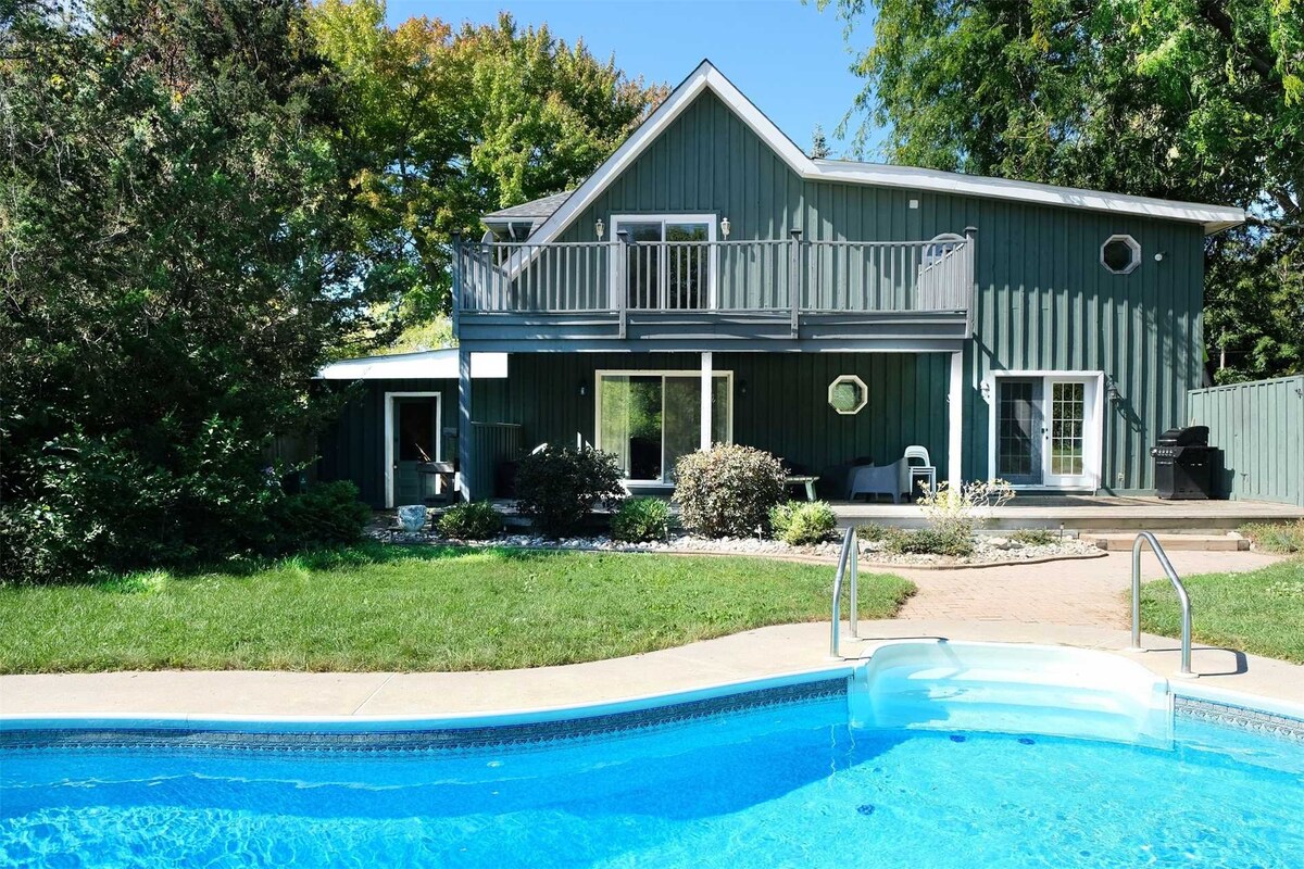 Selamat datang di The Eh Frame, A-frame mewah modern dengan pemandangan matahari terbenam yang tak terlupakan, dan spa lengkap! - Patio spa Nordic pribadi dengan bak mandi air panas, pancuran air dingin, dan sauna -3 kamar tidur nyaman dengan seprai mewah - Dapur lengkap & BBQ untuk malam pesta - Wi-Fi cepat, permainan papan & lubang api untuk waktu bersantai - Dekat dengan jalur hutan & danau Ontario - Pesan sekarang untuk berendam, bersantai, & bersantai